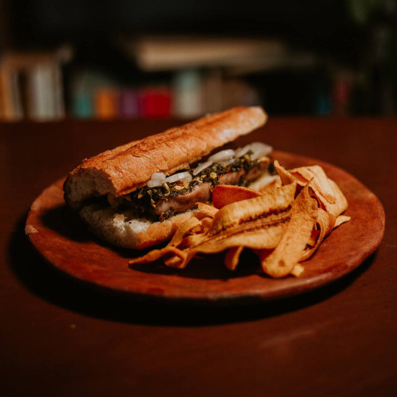 Pan masa madre baguet con aceite de ajo, chorizo argentino, mostaza dijon, chimichurri de la casa. Acompañado de plátanos fritos.