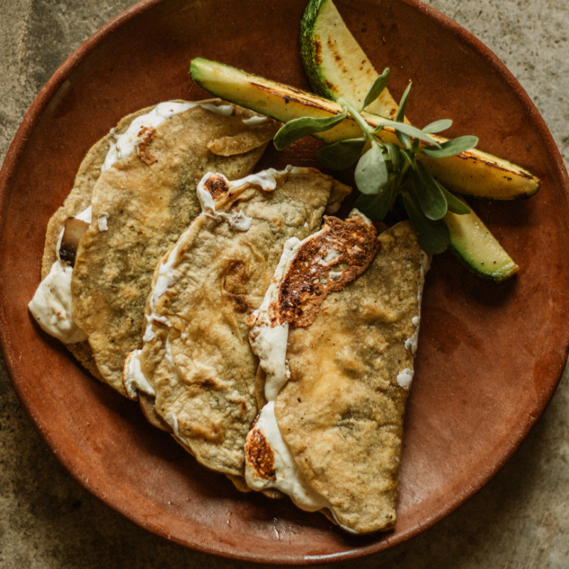 3 Tortillas de maíz con queso y champiñones al ajo con epazote, acompañados con calabaza asada y verdolagas.