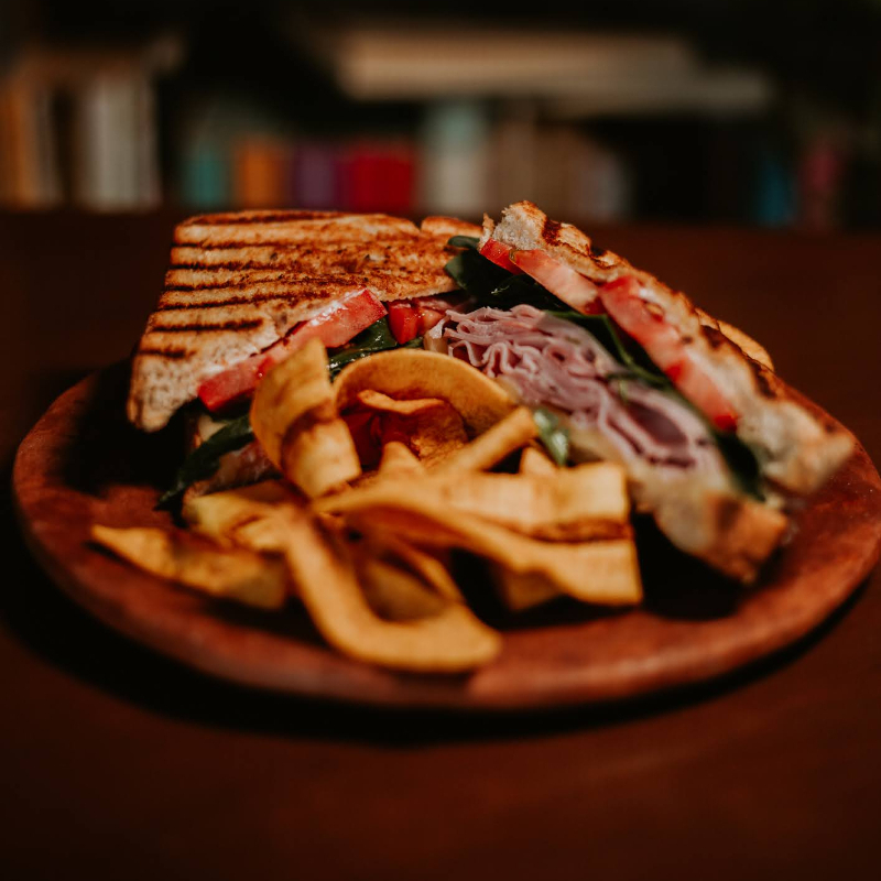 Pan artesanal multigrano con aceite de ajo, jamon, queso gouda, mayonesa, espinaca, jitomate. Acompañado de plátanos fritos.