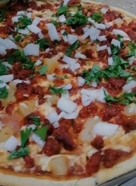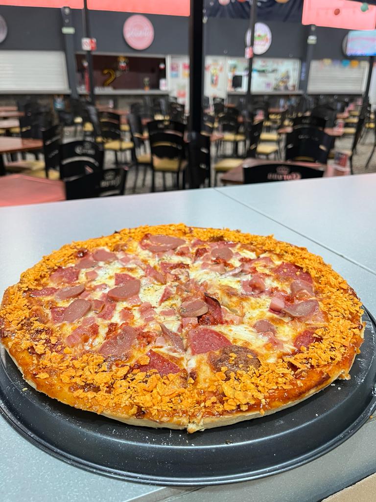 Base hawaiana, pepperoni, carnes frías ó pastor, con orilla de salsa BBQ y doritos.