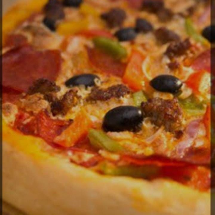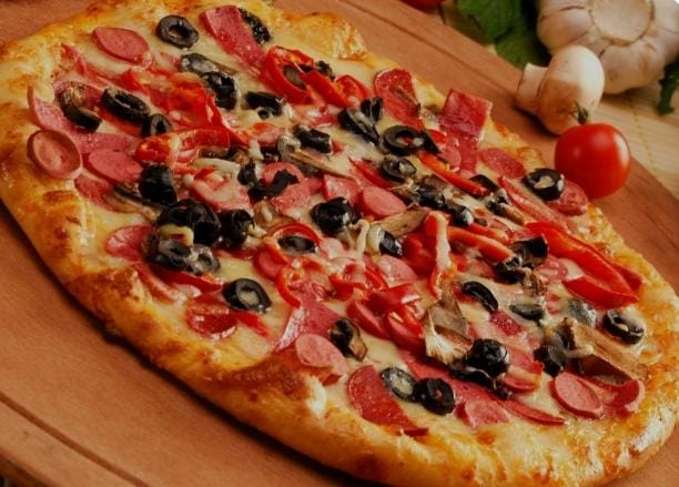 Pepperoni, salchicha para asar, champiñones, pimiento rojo y aceitunas negras.