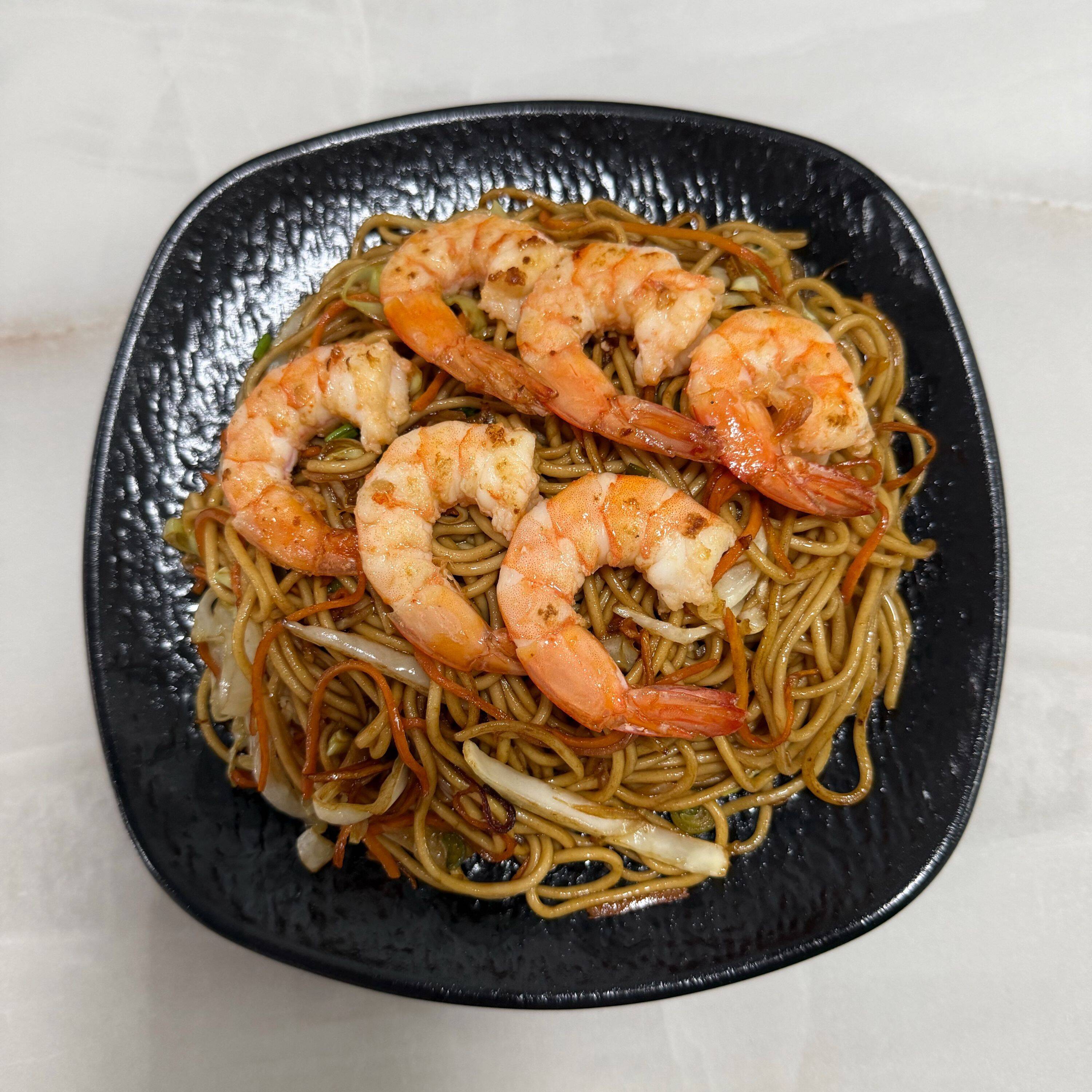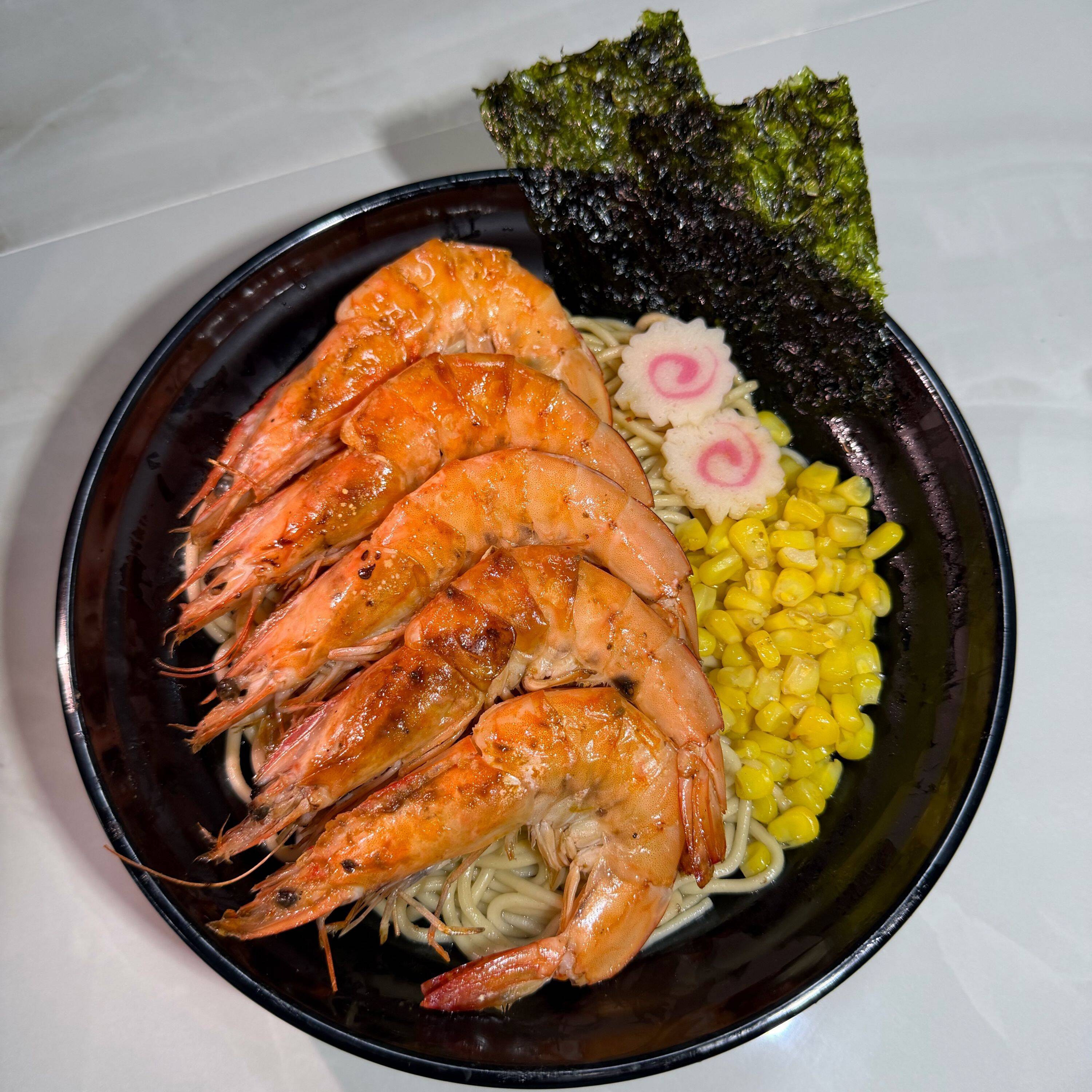 Sopa de pasta Ramen con camarones, granos de elote, maki y alga