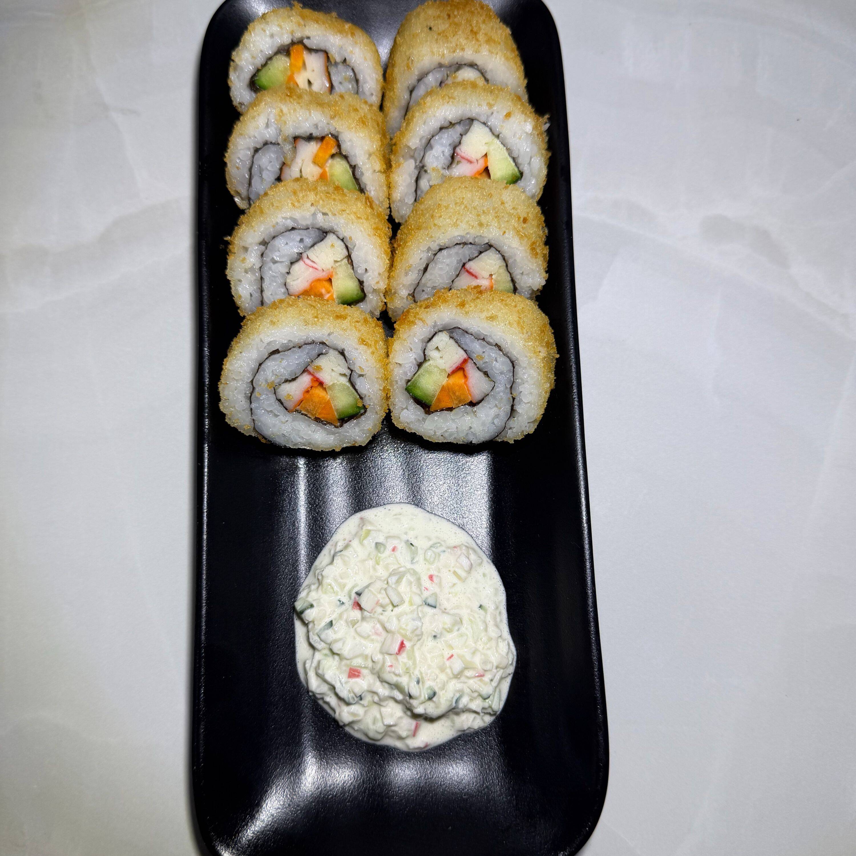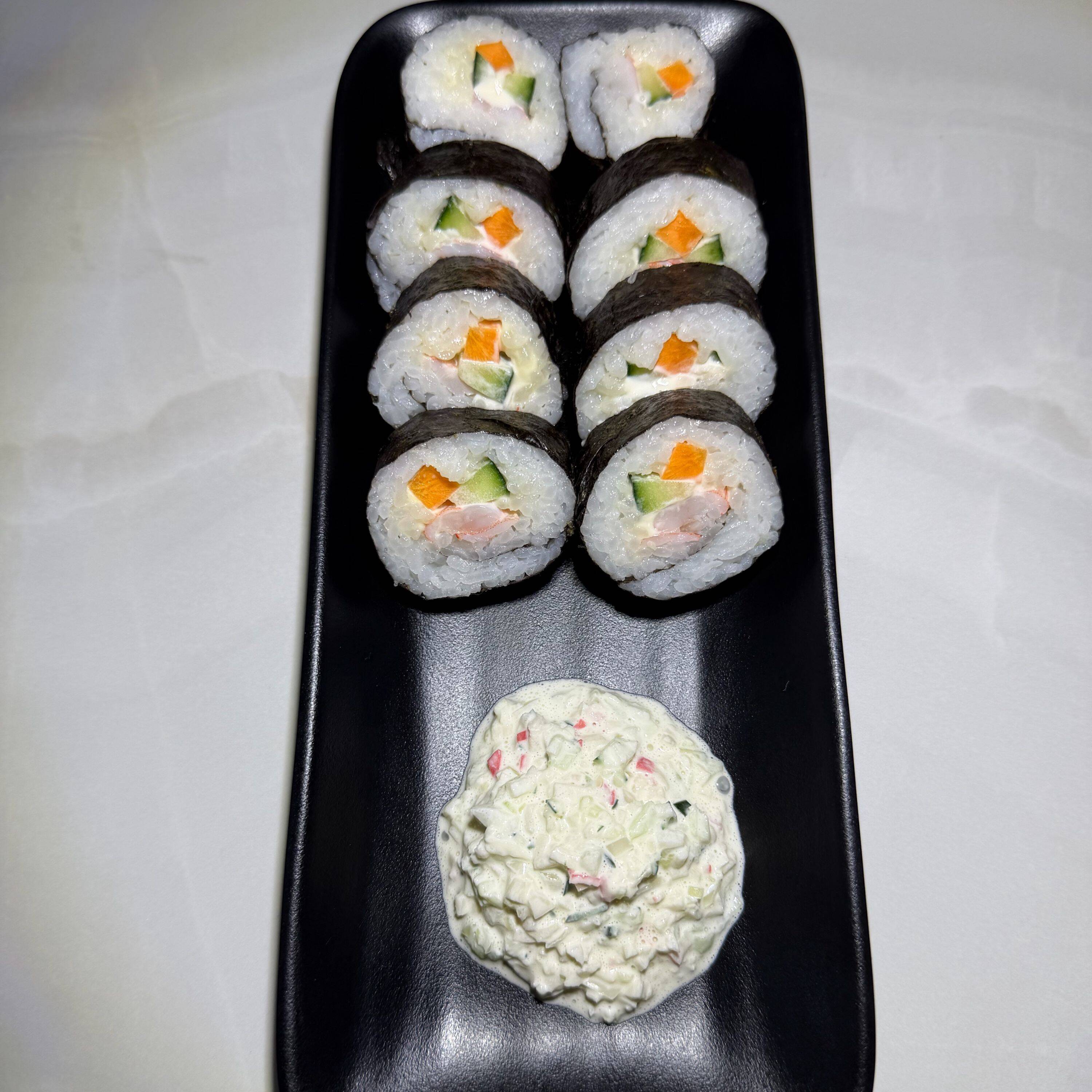Arroz, alga, pepino, zanahoria, camarón, frito