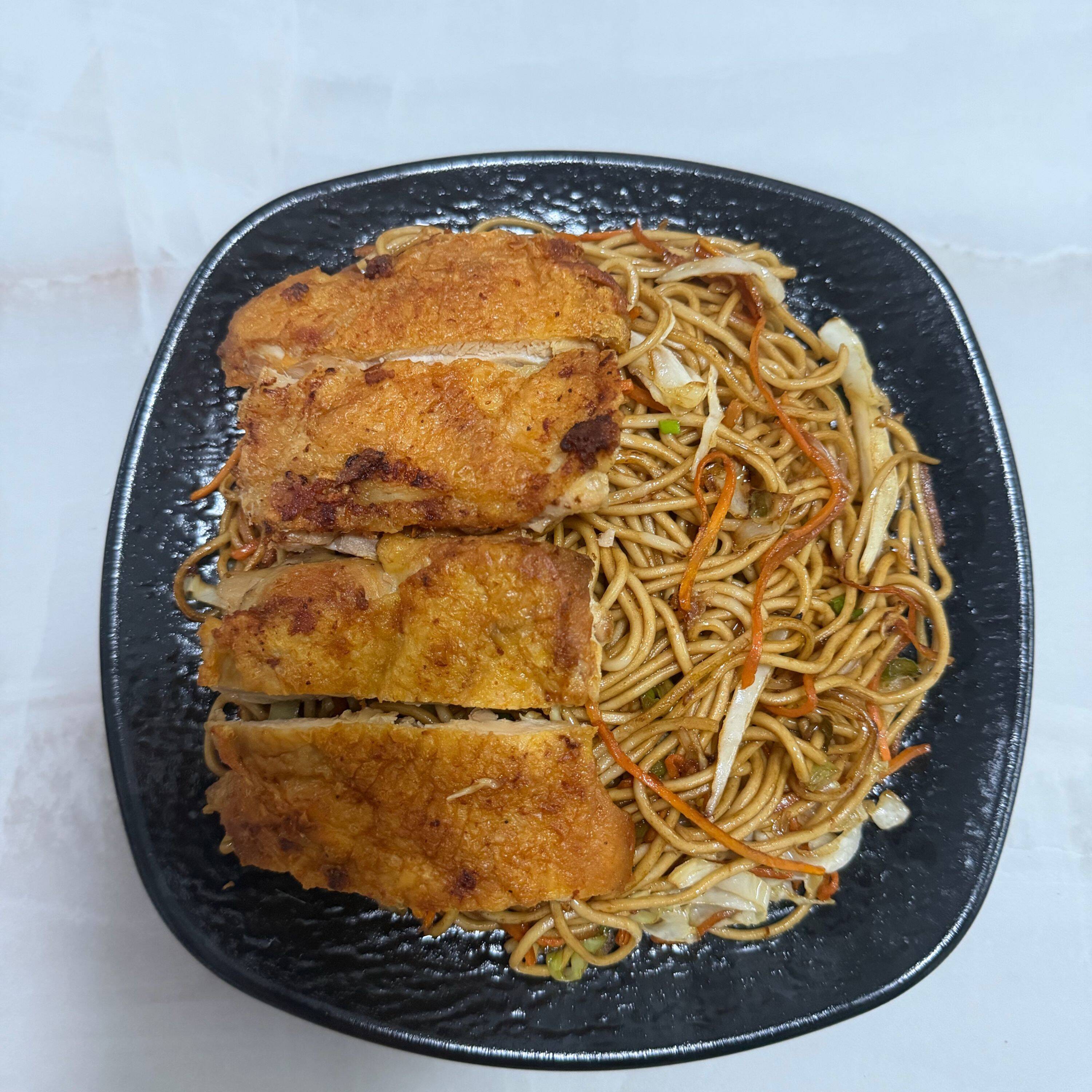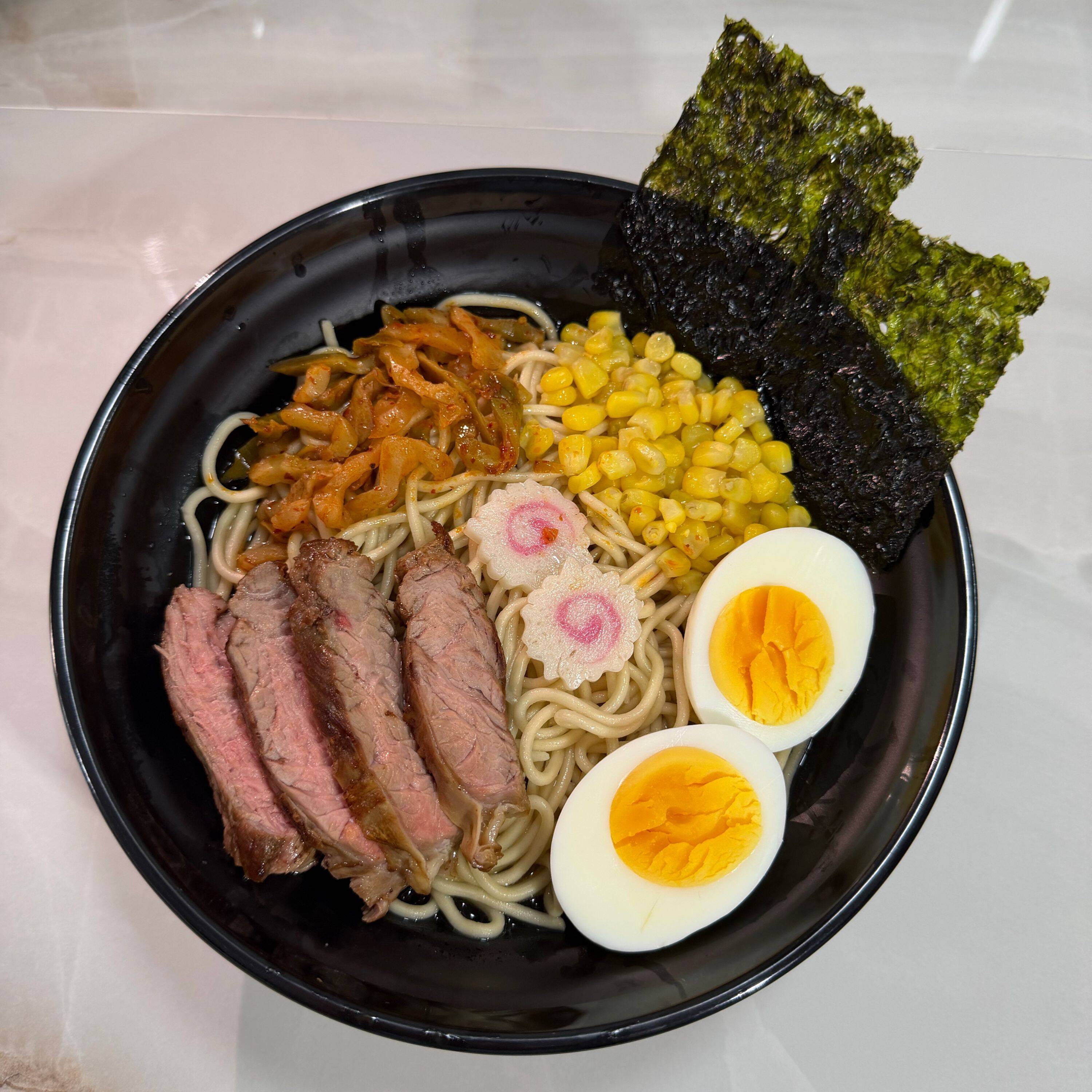 Sopa de Ramen con arrachera, huevo, granos de elote, verdura alga y maki