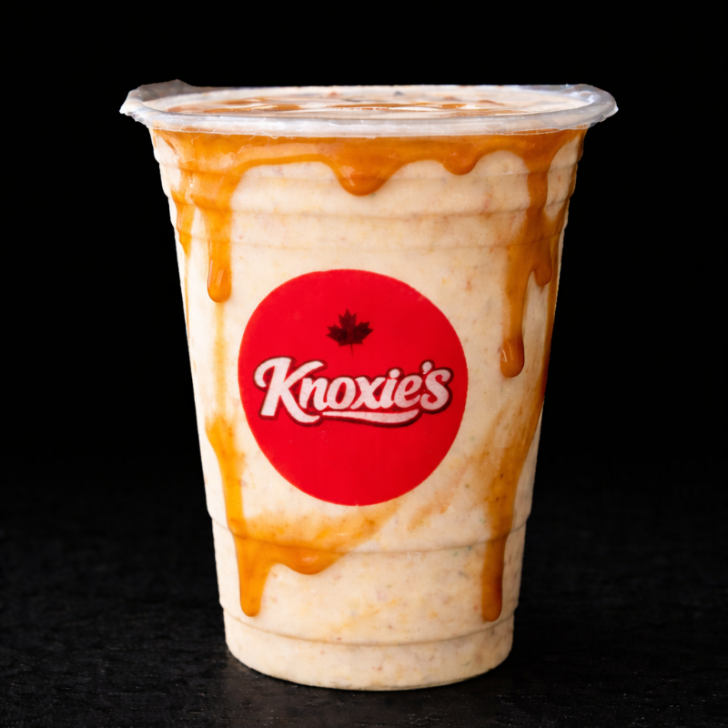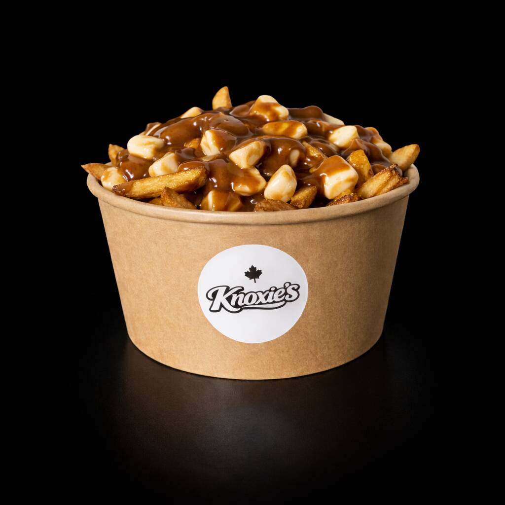Poutine tradicional en porción grande, con gravy y queso.