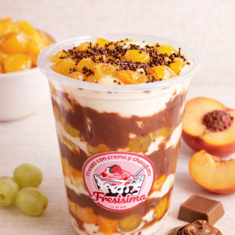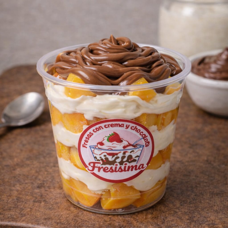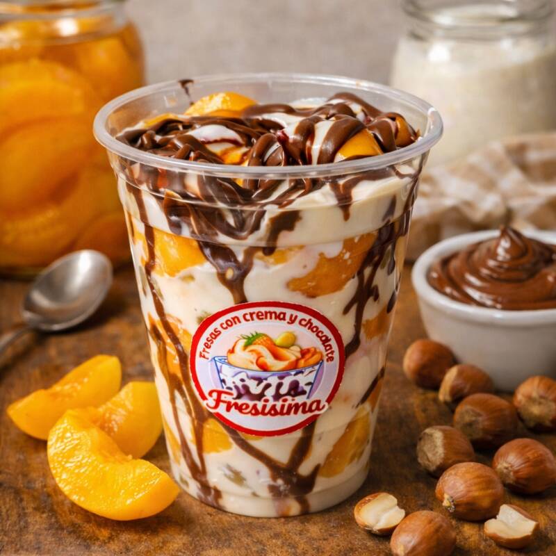 Durazno en almibar sumergido en la crema tradicional de la casa y crema de avellanas untada. En presentación de 16 onzas.