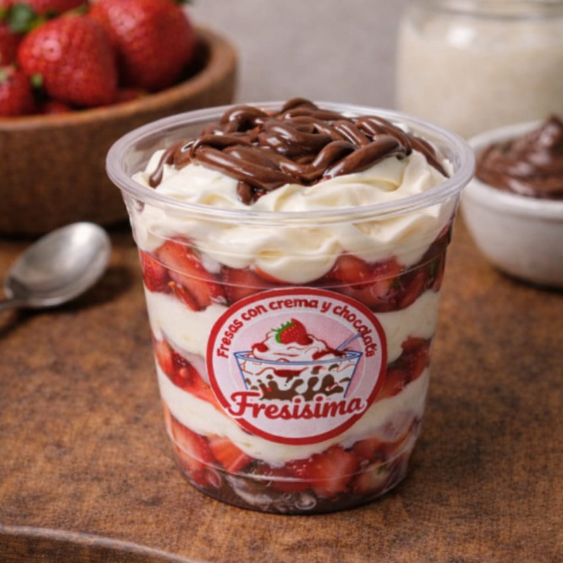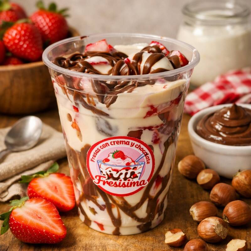 Fresas sumergidas en la crema tradicional de la casa y crema de avellanas untada. En presentación de 16 onzas.