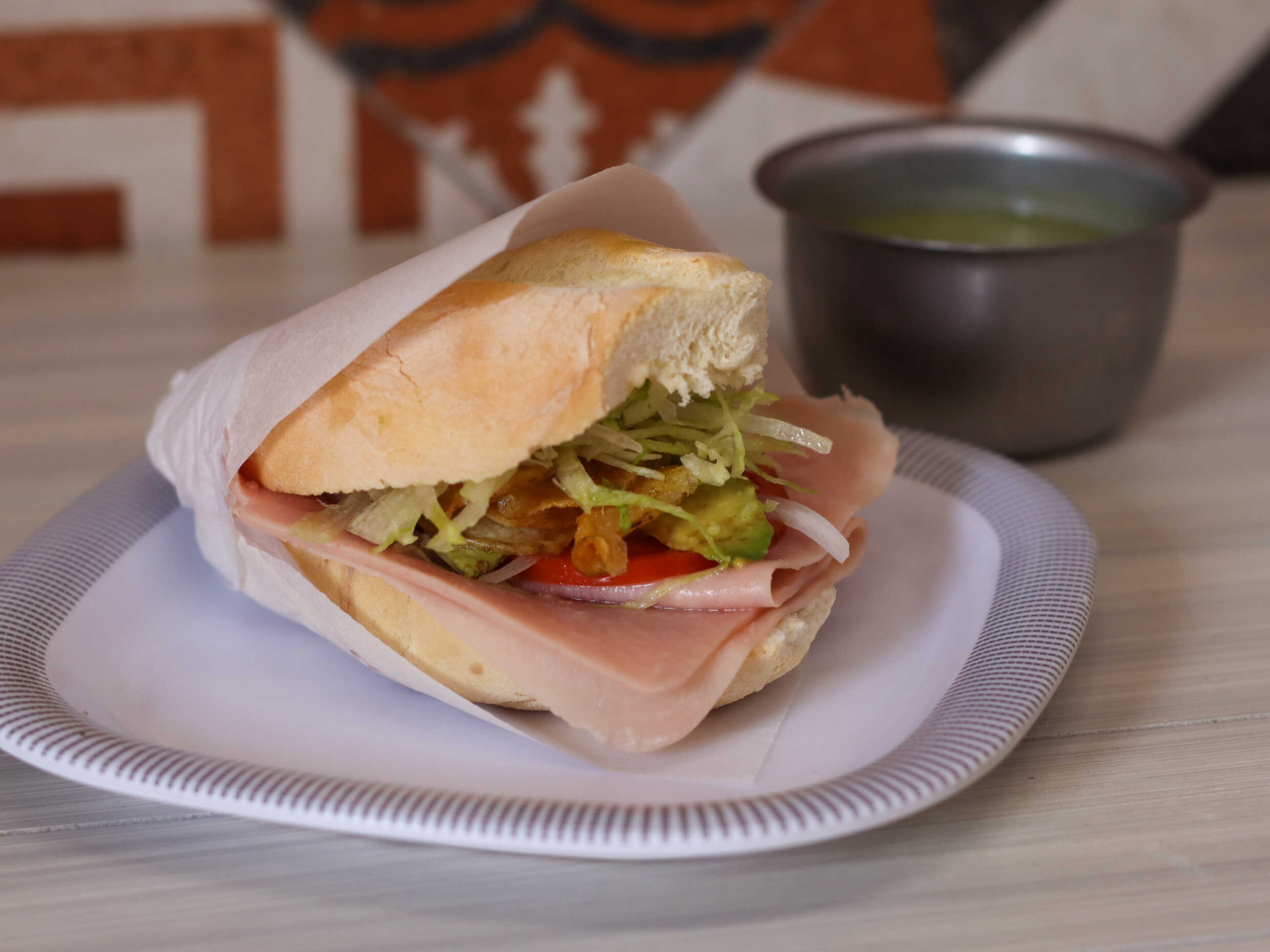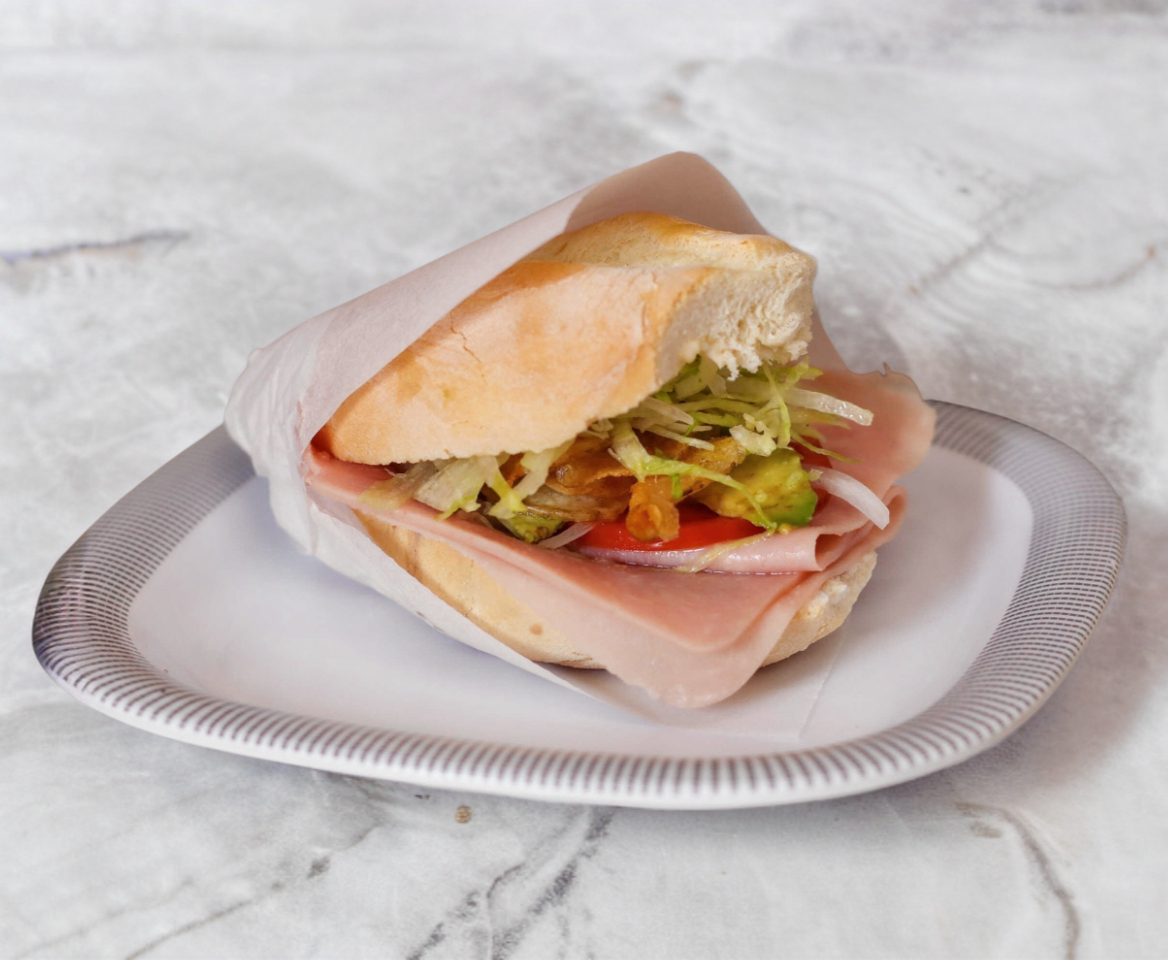 Torta de jamón de puerco, acompañada de frijolitos, mayonesa, vinagreta de la casa, papas y vegetales frescos. (Lechuga, jitomate y cebolla y aguacate.).