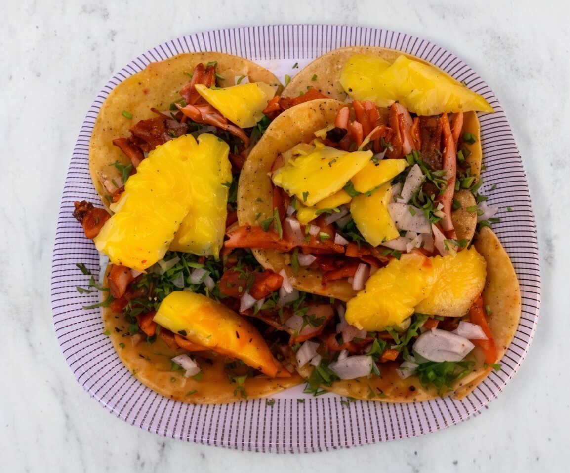 3 tacos de pastor con tortilla de harina y queso manchego, acompañados con cilantro, cebolla y piña.