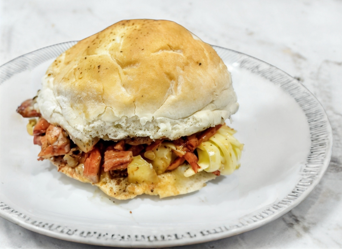 Pambazo de pastor con queso, piña, frijoles y mayonesa.