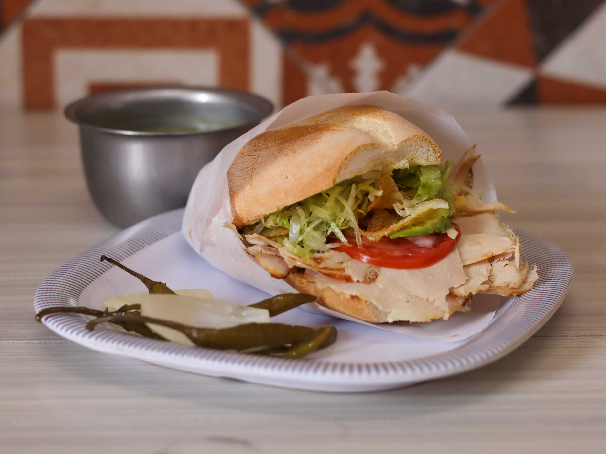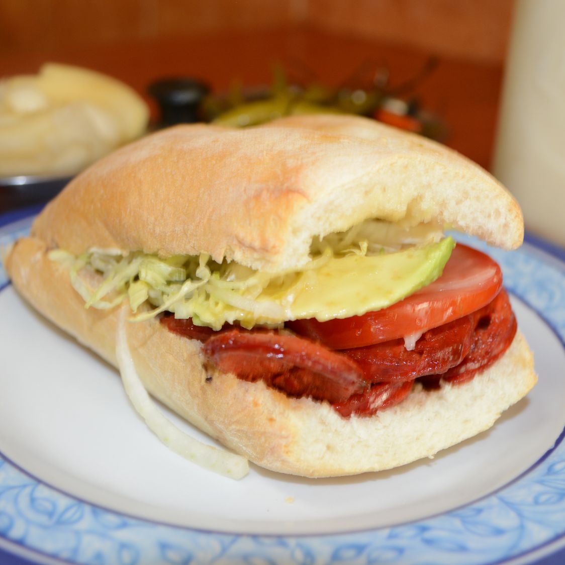 Pan grande de 20 cm. Pierna, jamón, salchicha, pollo y queso manchego, con vinagreta de la casa y con vegetales frescos. (Lechuga, jitomate y cebolla.)