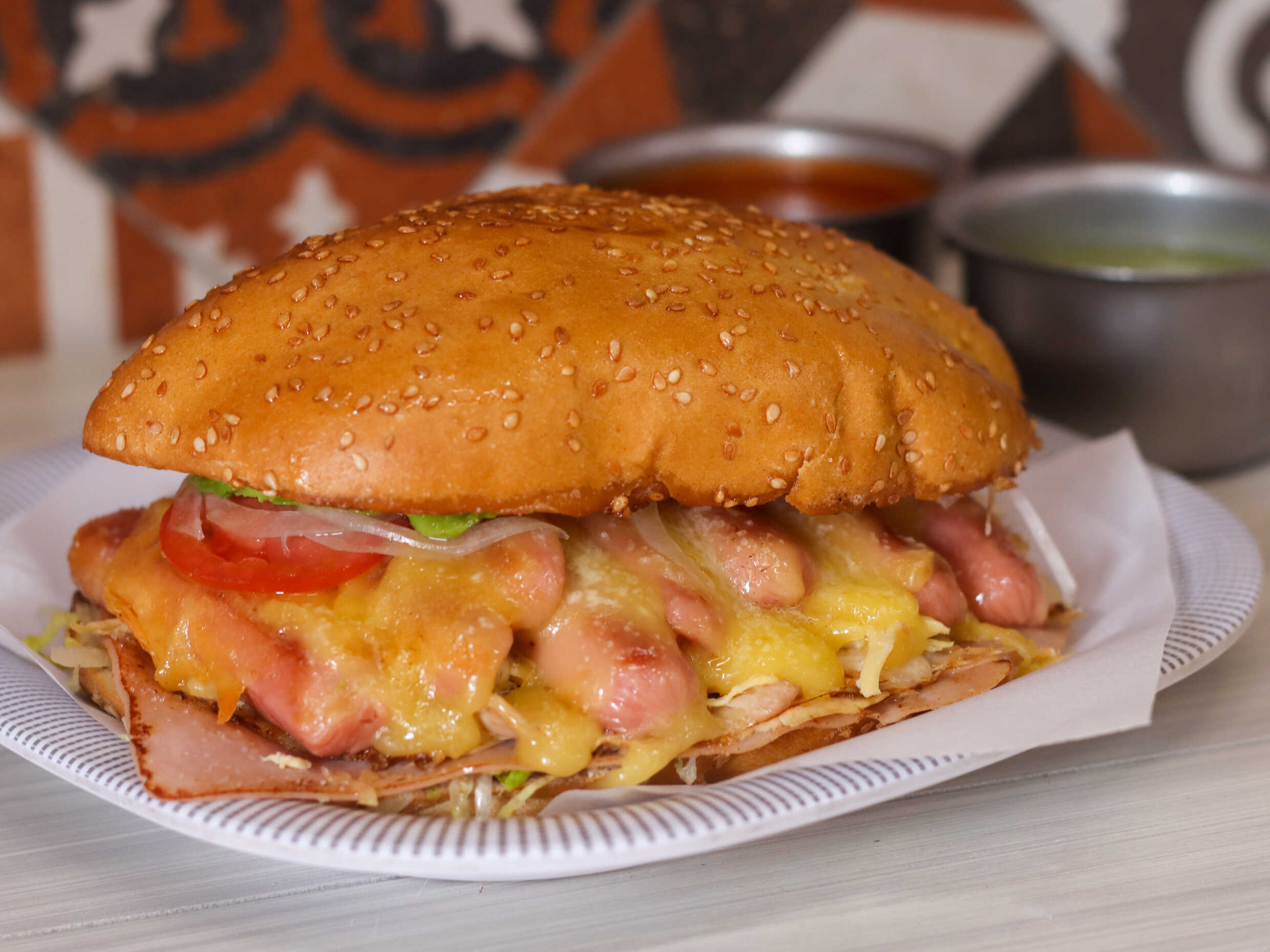 Torta de salchicha asada con queso de hebra, acompañada de mayonesa, vinagreta de la casa, y vegetales frescos. (Jitomate, cebolla y aguacate.)
