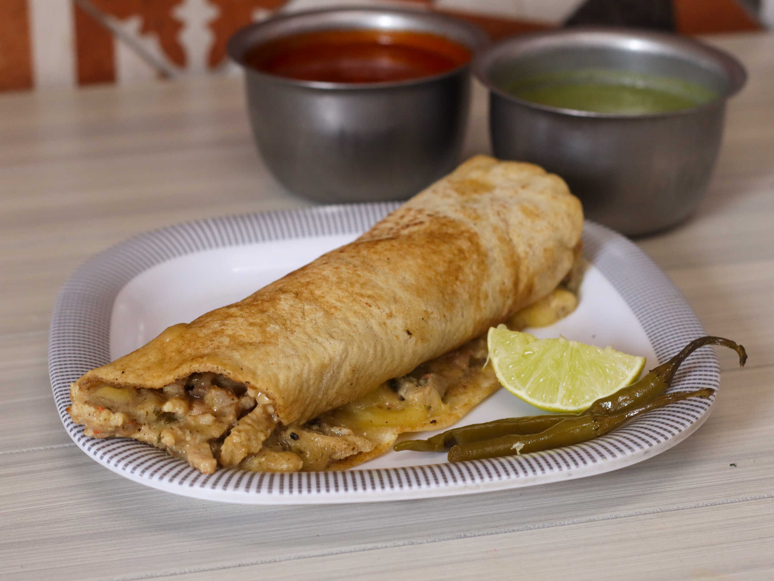 Torta de carne enchilada con queso manchego, acompañada de frijolitos y mayonesa.