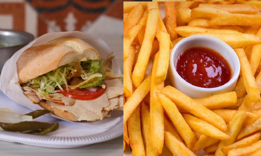 Jamón, pollo, queso amarillo, tocino, mayonesa, aguacate, cebolla, jitomate y una guarnición de papas a la francesa.