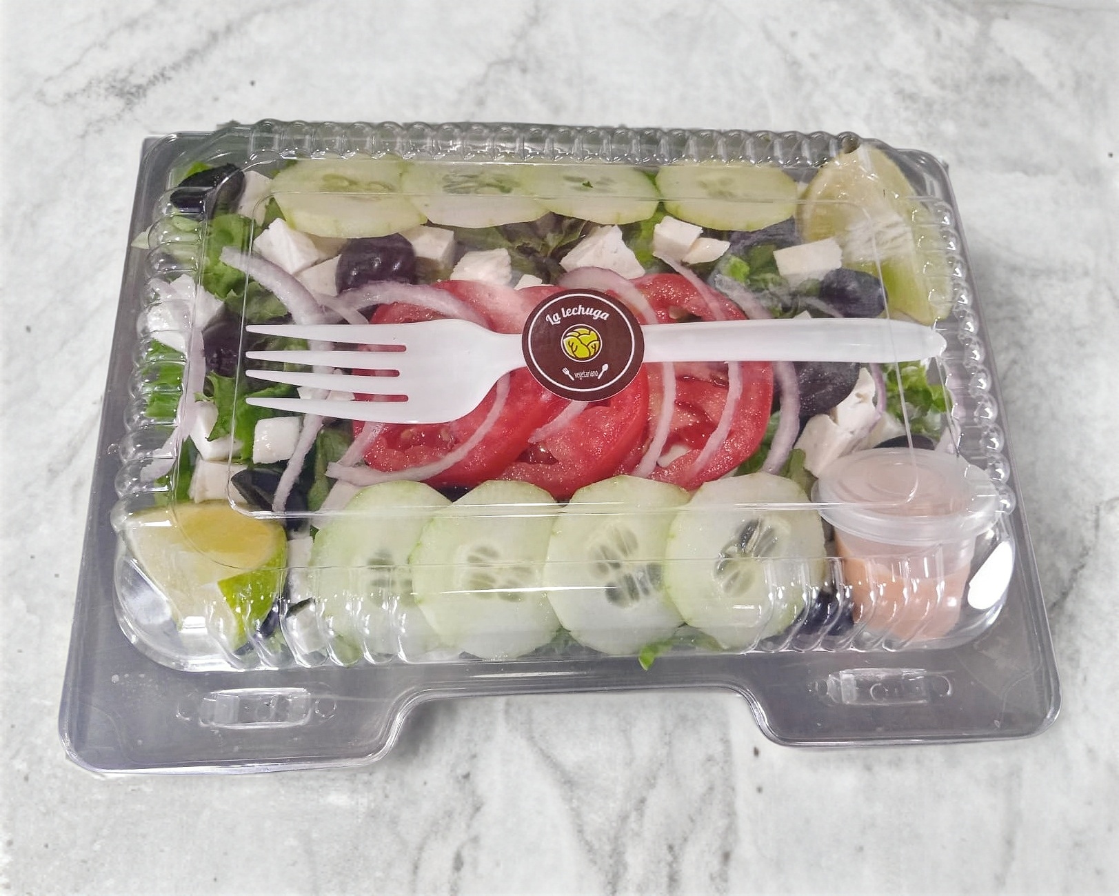 Lechuga, jitomate, cebolla, queso de cabra, pepino y aceitunas negras.