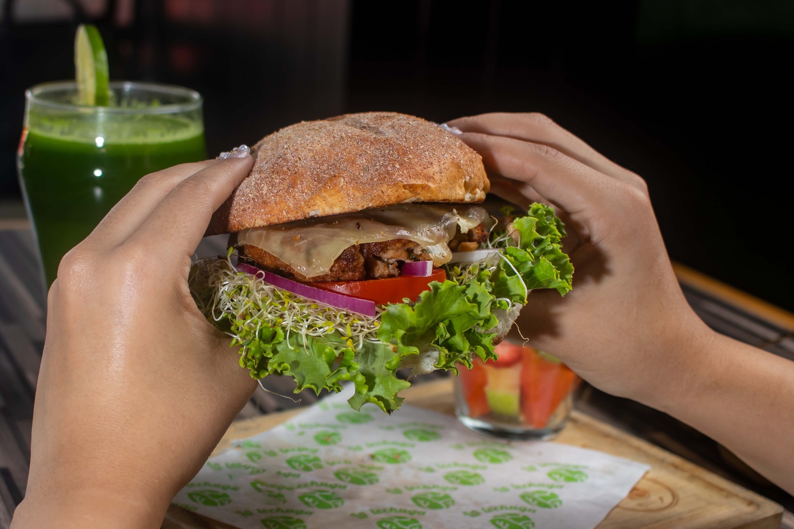 Carne vegana, lechuga, germinado, jitomate y queso manchego.