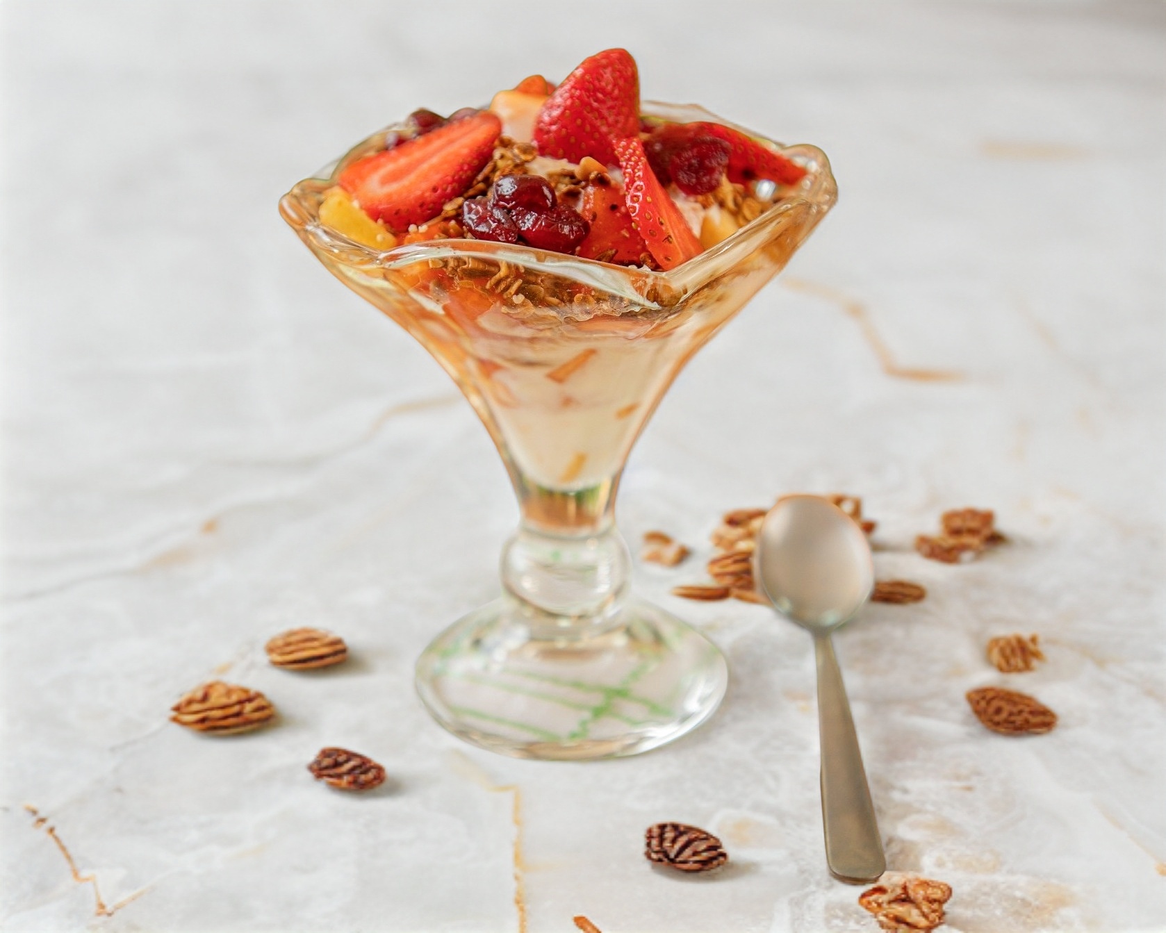 Copa de fresa con yogurt, miel y granola.