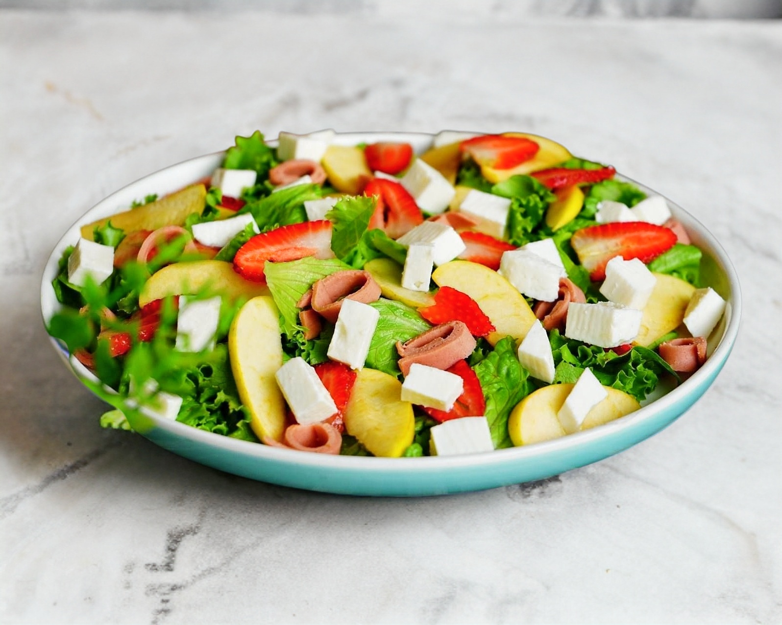 Lechuga, fresa, manzana, jamòn vegetariano y queso de cabra.