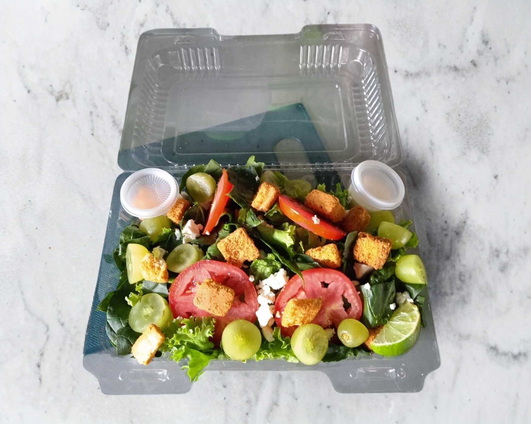 Lechuga, espinaca, jitomate, uva, queso de cabra y crutones.