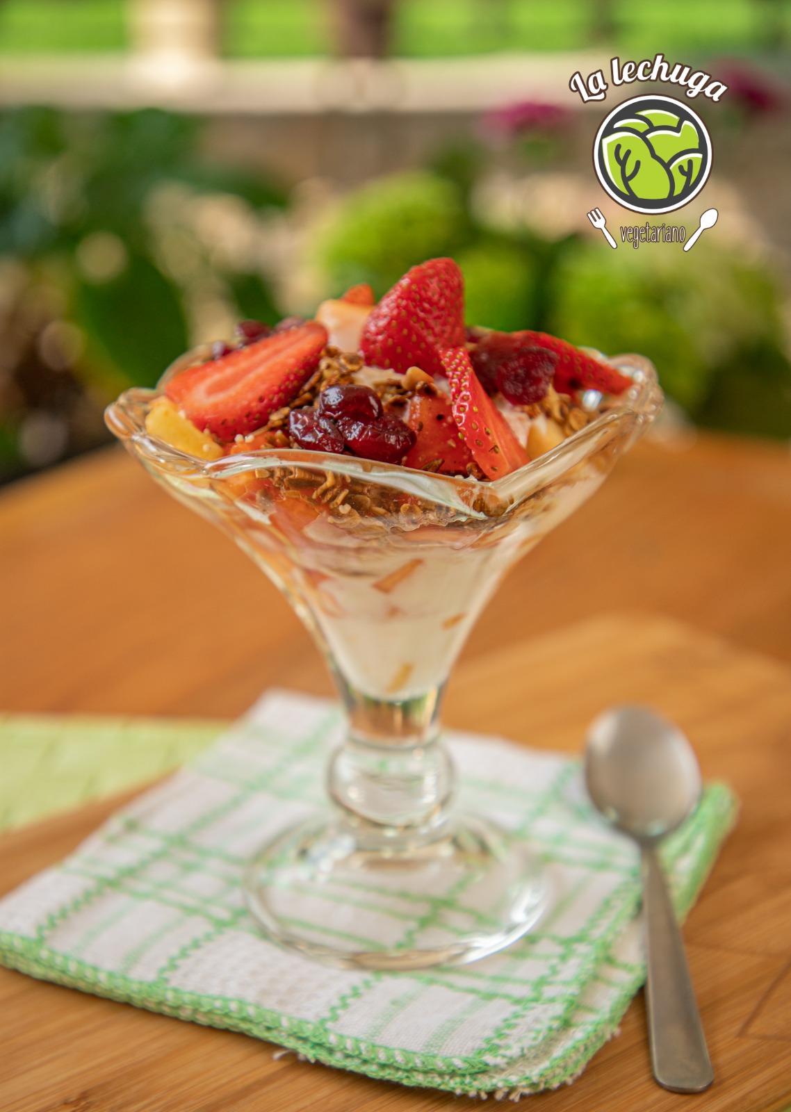 Cóctel de fruta natural acompañado de yogurt, granola y miel.