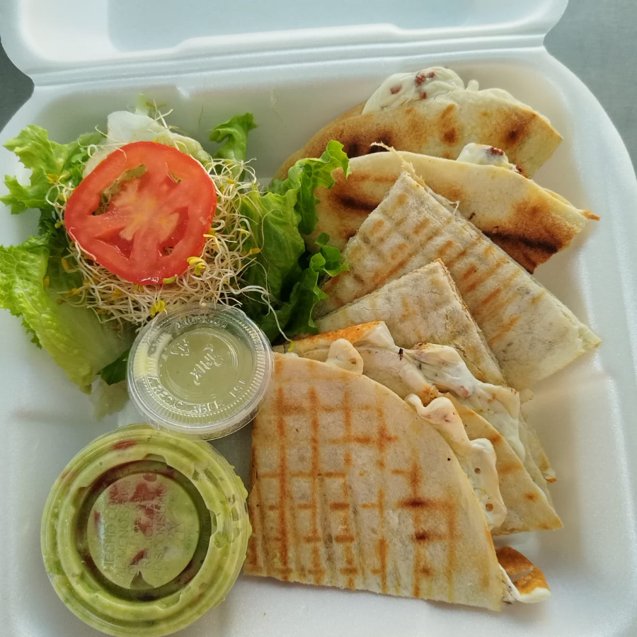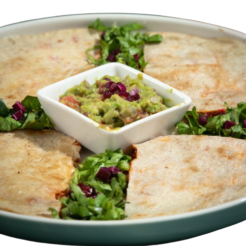 Queso de hebra y manchego. Acompañado de guarnición de ensalada y guacamole.