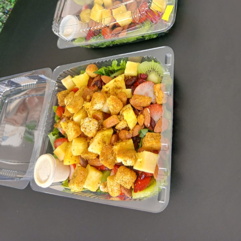Lechuga, espinaca, kiwi, fresa, aràndanos, almendras y crutones.