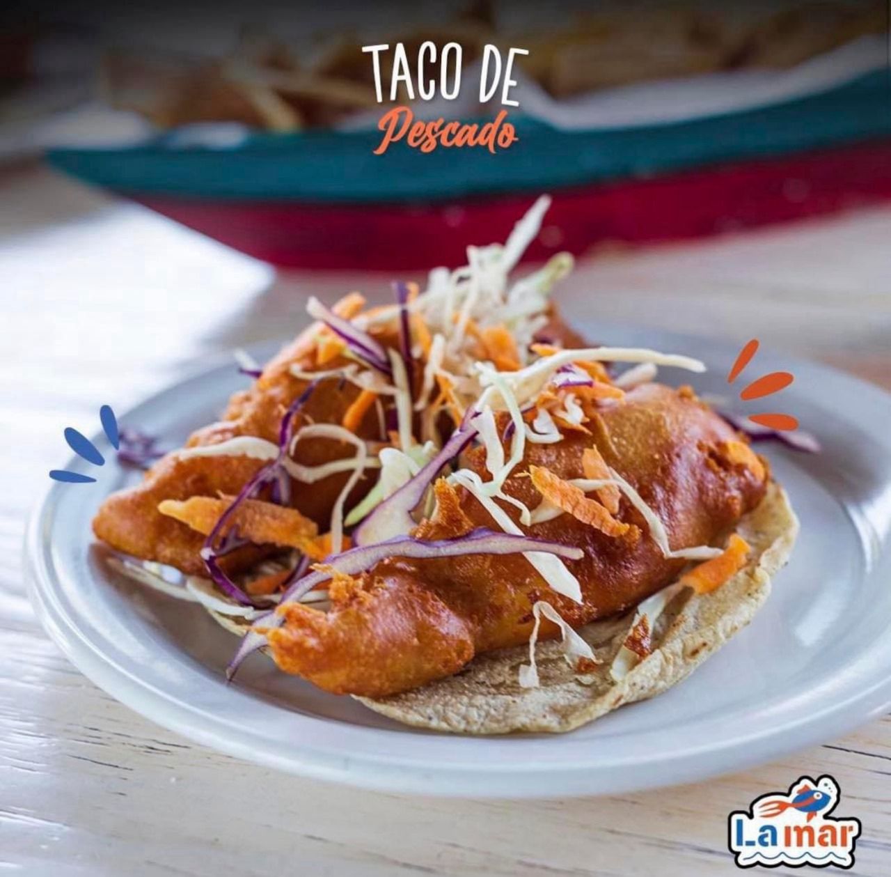 Taco de tortilla de maíz, con tiras de filete de pescado rebosado, ensalada de col blanca, col morada y zanahoria.