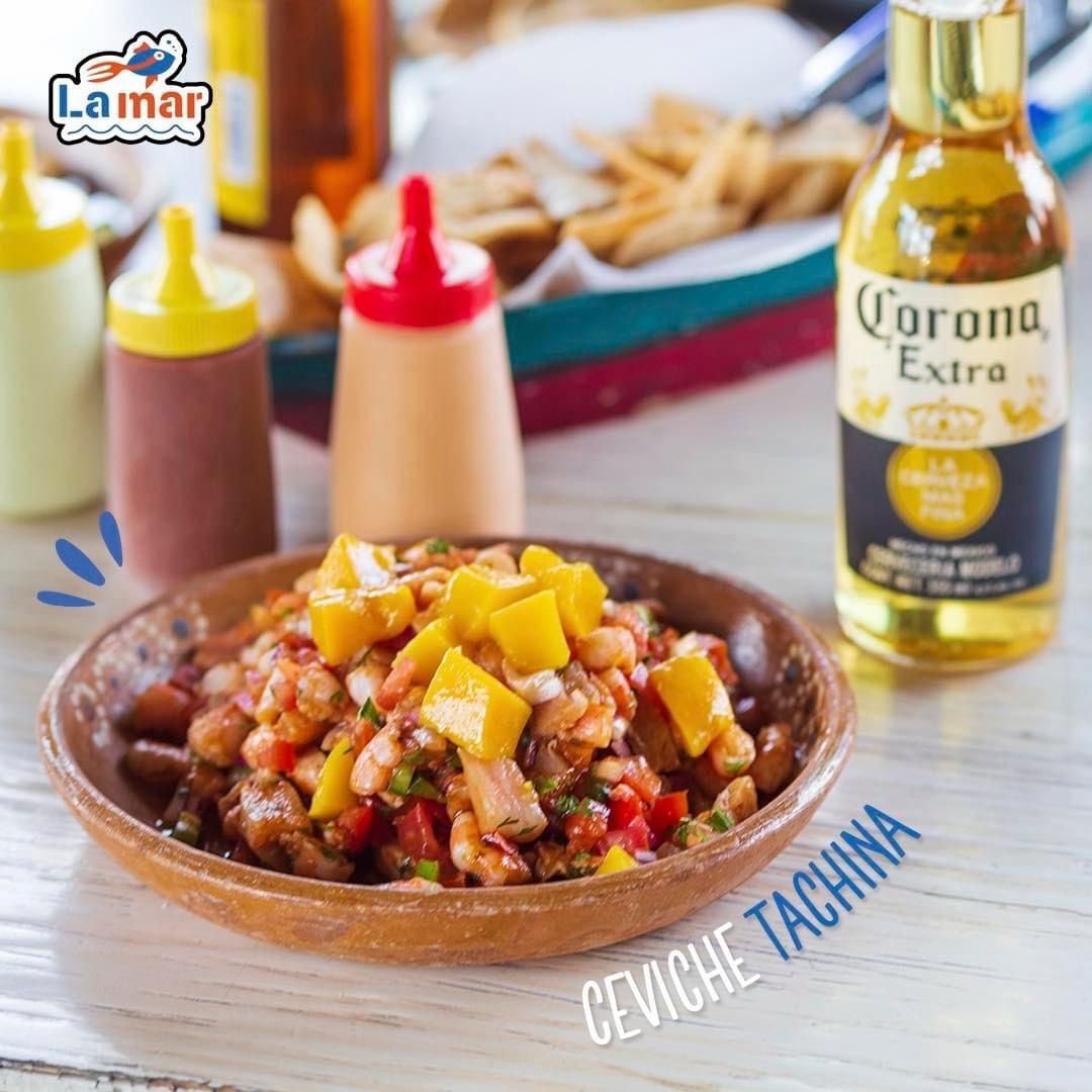Ceviche de pescado y pulpa de camarón, adicionado con nuestra salsa de la casa, jitomate, cebolla, jalapeño y cilantro, decorado con mango.