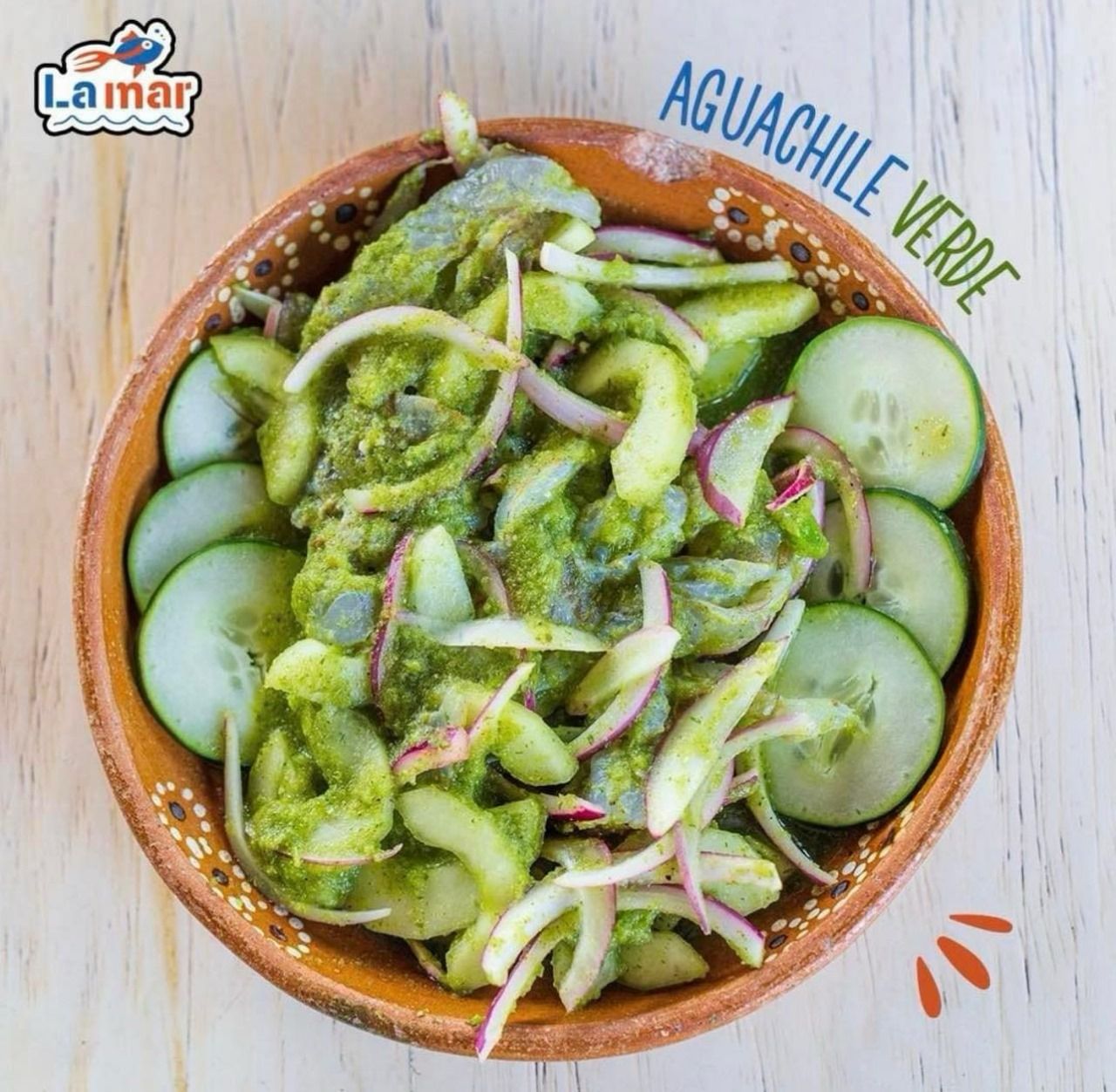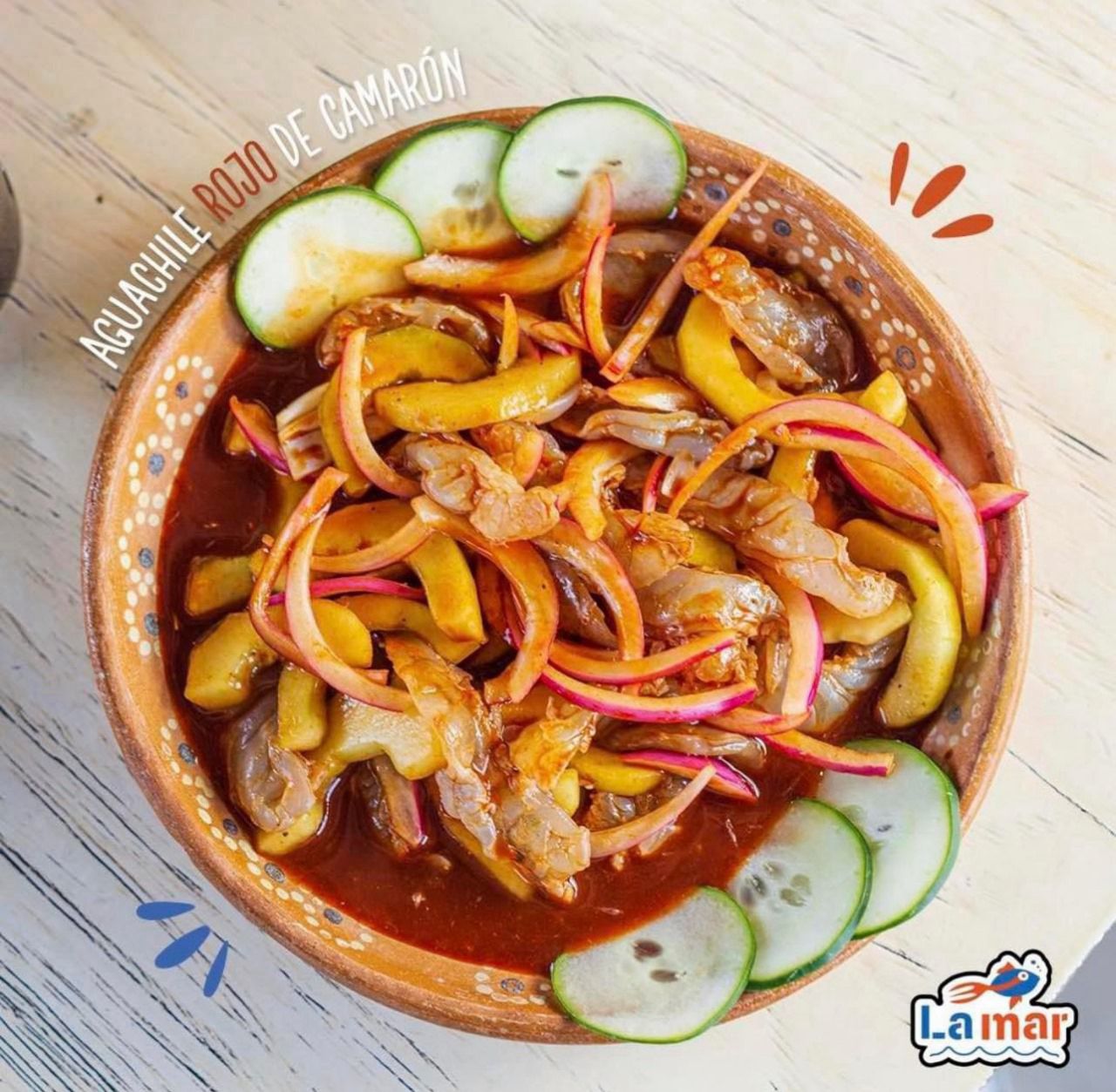 Camarones curtidos en salsa de la casa, acompañados de cebolla morada, pepino y aguacate.