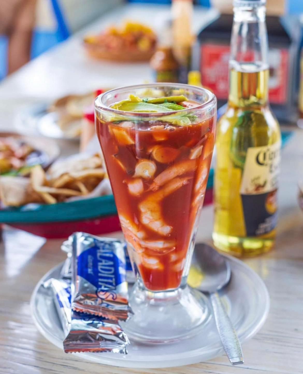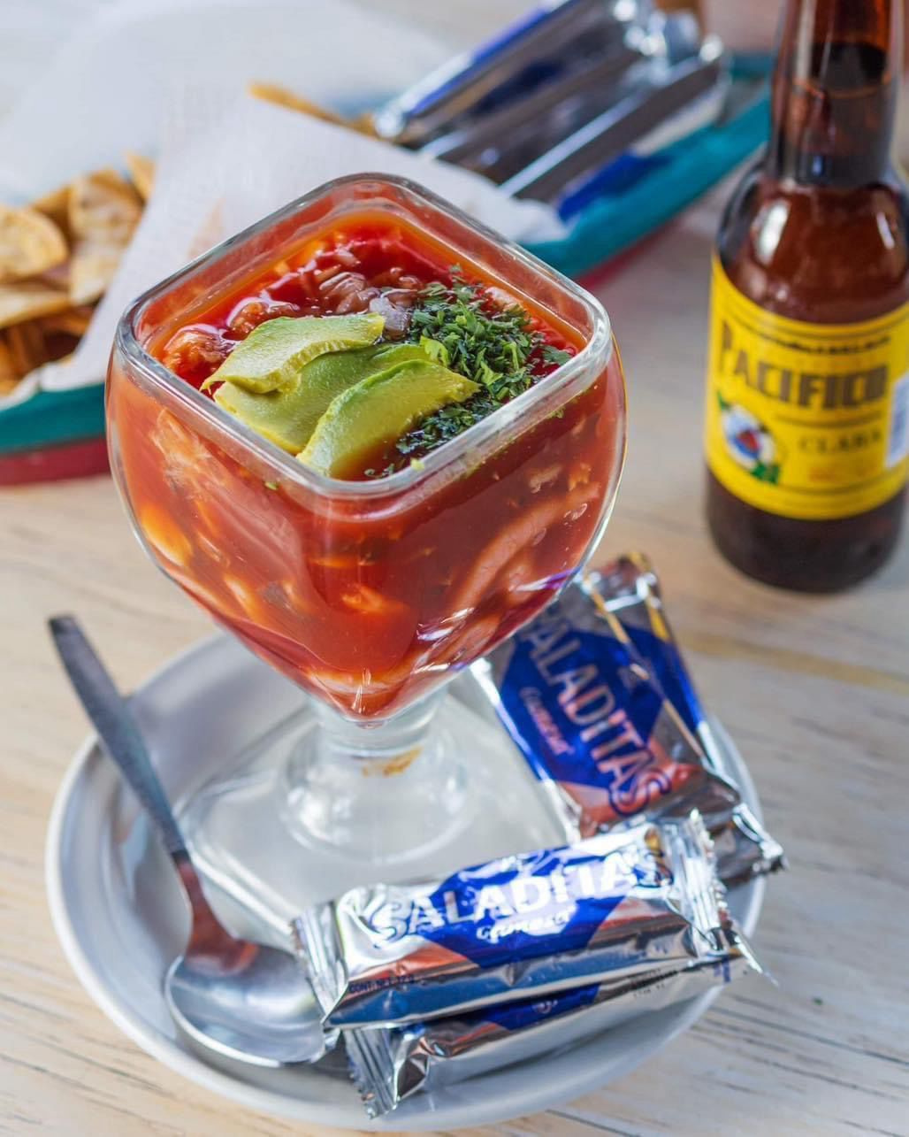 250 g de marisco, base de salsa cátsup, cebolla, cilantro y aguacate.