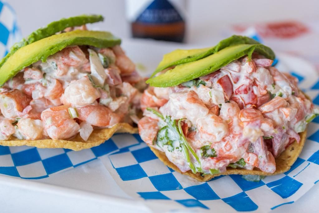 2 Tostadas con mezcla de camarón, cebolla, cilantro jalapeño, jitomate y mayonesa, acompañadas con aguacate.