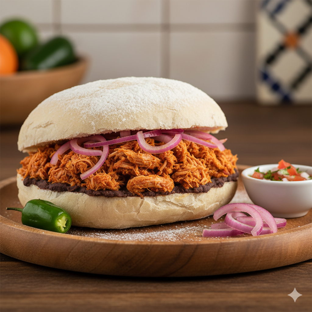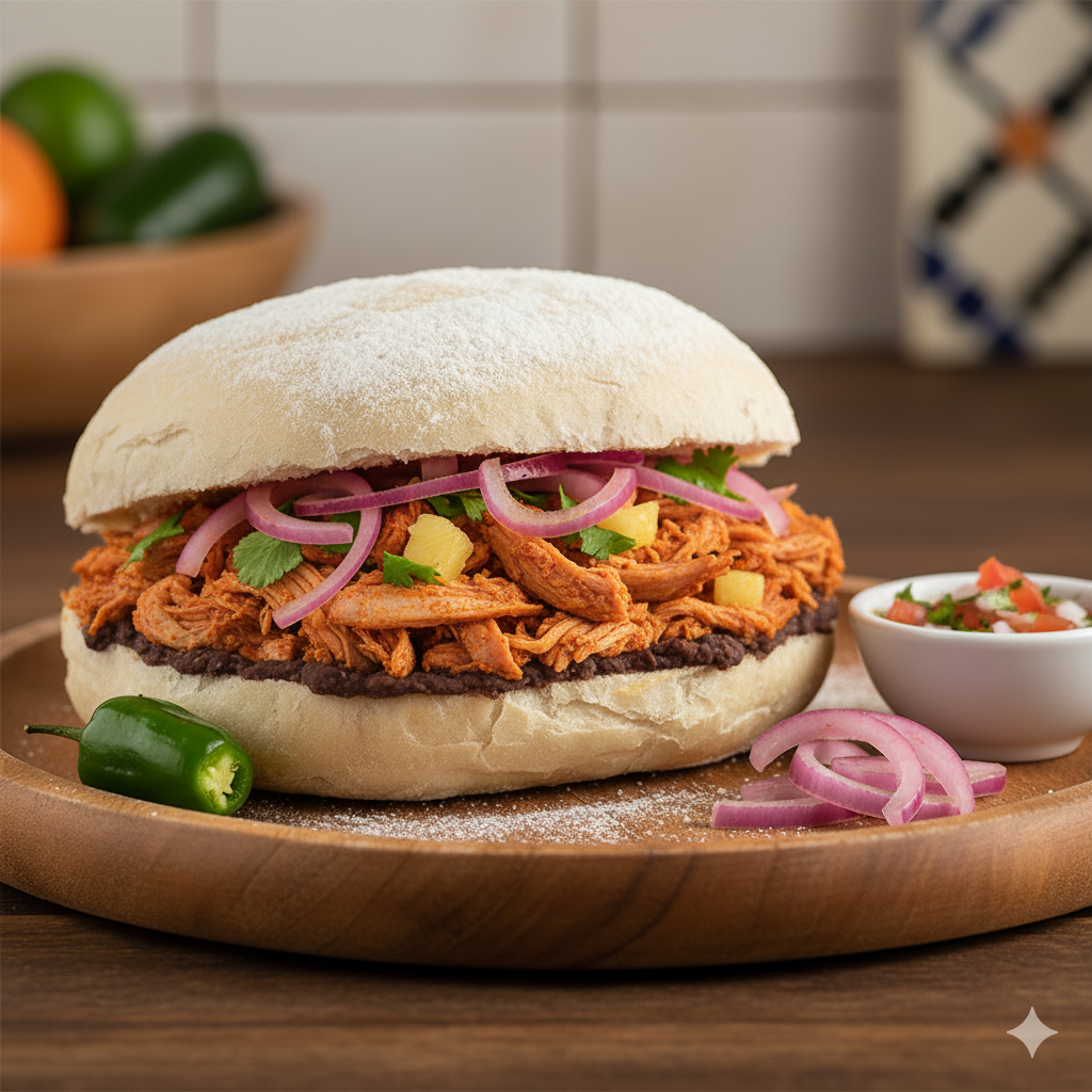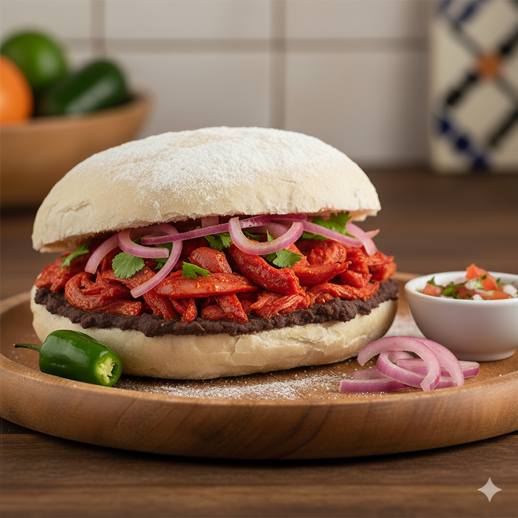 Pambazo con el tradicional guiso yucateco de carne de cerdo marinada en achiote y cocinada a fuego lento y queso gouda.