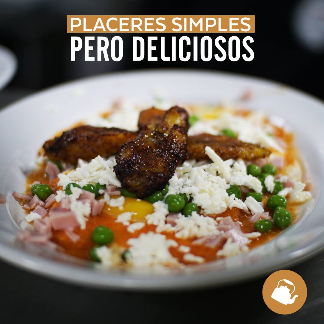 2 huevos estrellados sobre tortilla frita con frijol, bañados en salsa ranchera con chicharos, jamón y plátano frito