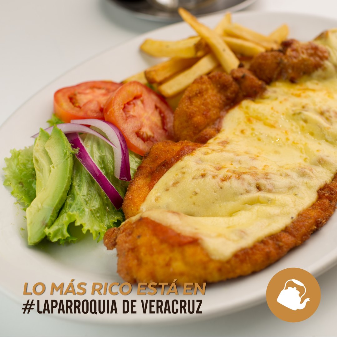 Pechuga de pollo empanizada con salsa italiana, gratinada con queso, acompañada de ensalada y papas a la francesa