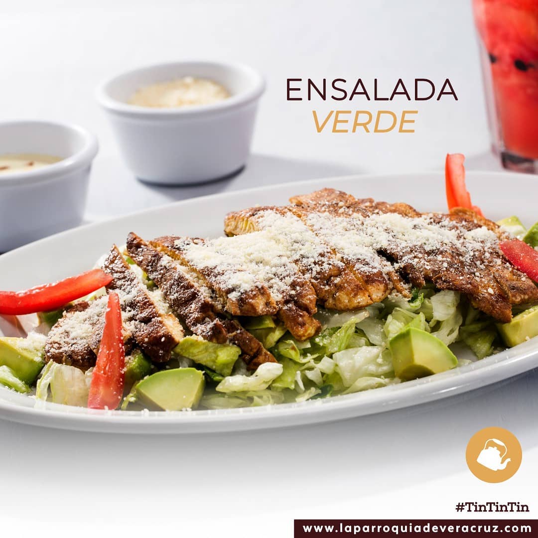 Con pechuga de pollo a la plancha, lechuga, cuadritos de queso panela, aguacate, tiras de tortilla y chile guajillo