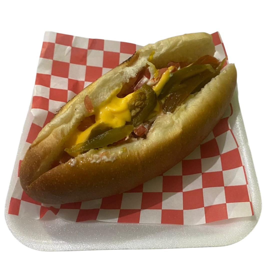MAYONESA,CATSUP,MOSTAZA,QUESO LIQUIDO,CEBOLLA,JITOMATE,JAMON,QUESO HEBRA,TOCINO Y PICANTE.