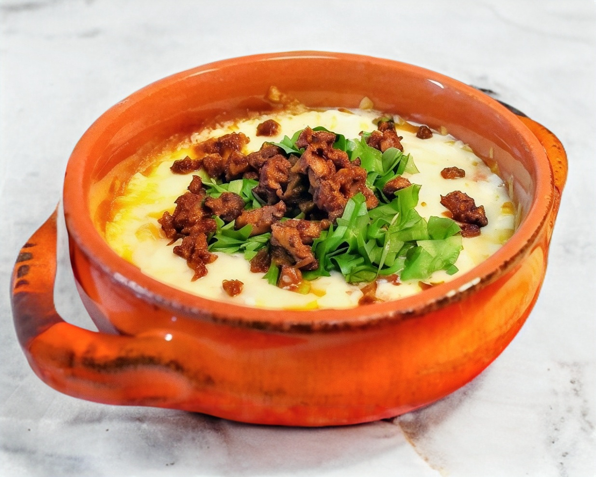 Delicioso fundido con queso mozzarella y carne, acompañado de 3 tortillas de harina.