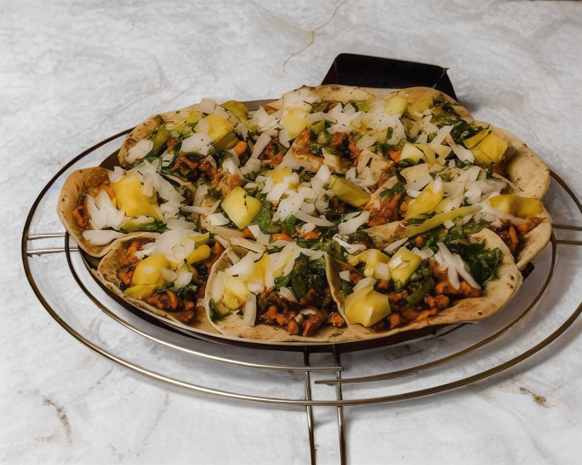 Deliciosa preparación con tortilla de harina, carne, queso, cebolla, cilantro y piña.