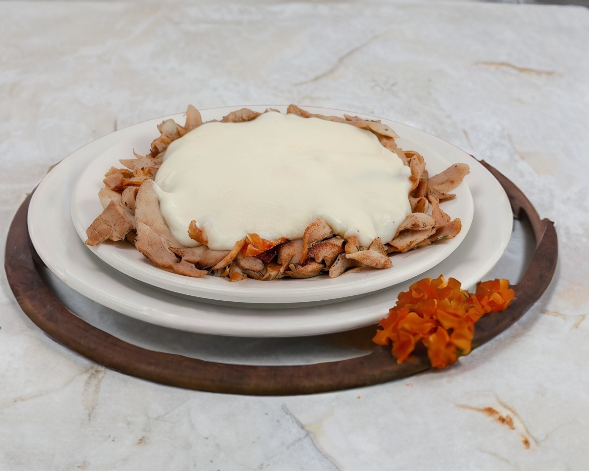 Deliciosa preparación con pan árabe, carne, queso, cebolla y cilantro.
