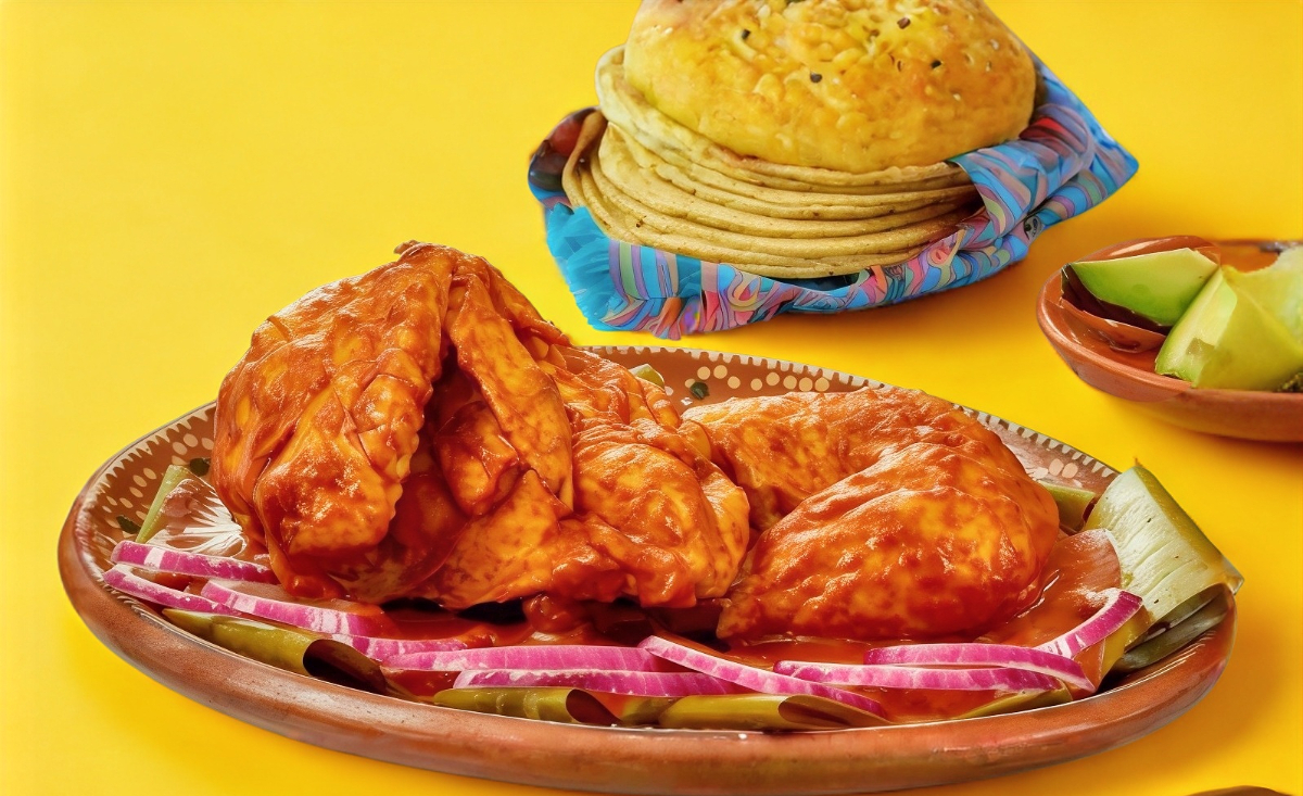 Caldo rojo de pechuga, molleja o hígado, con 2 huevos, totopos y cebollita picada.