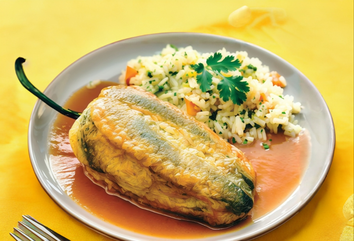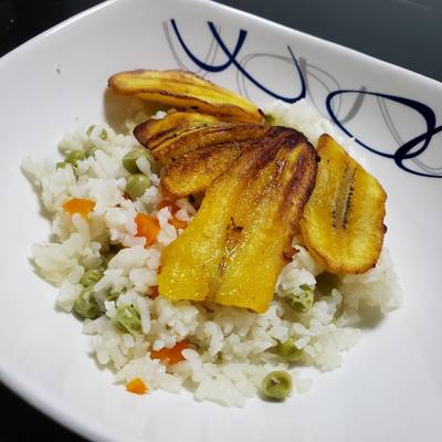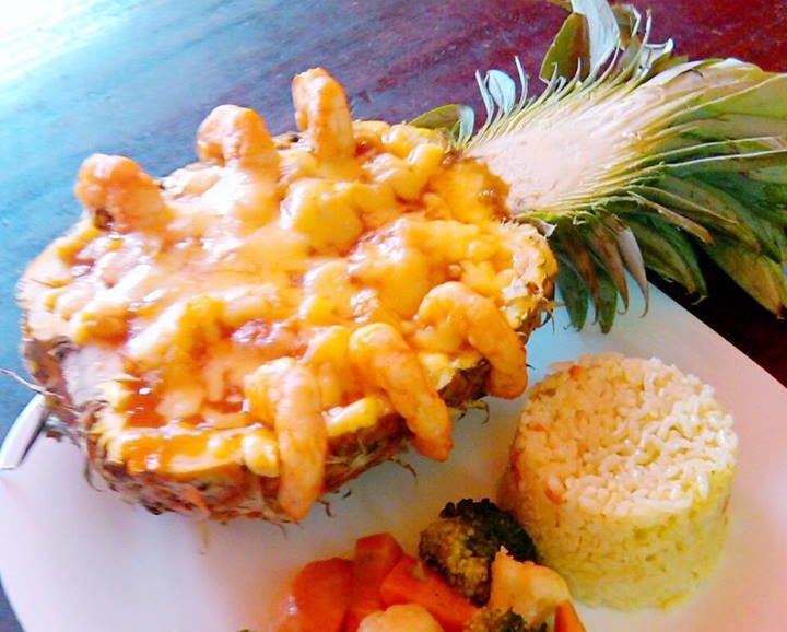 Camarones dorados con mantequilla y limón, acompañados con arroz y vegetales.