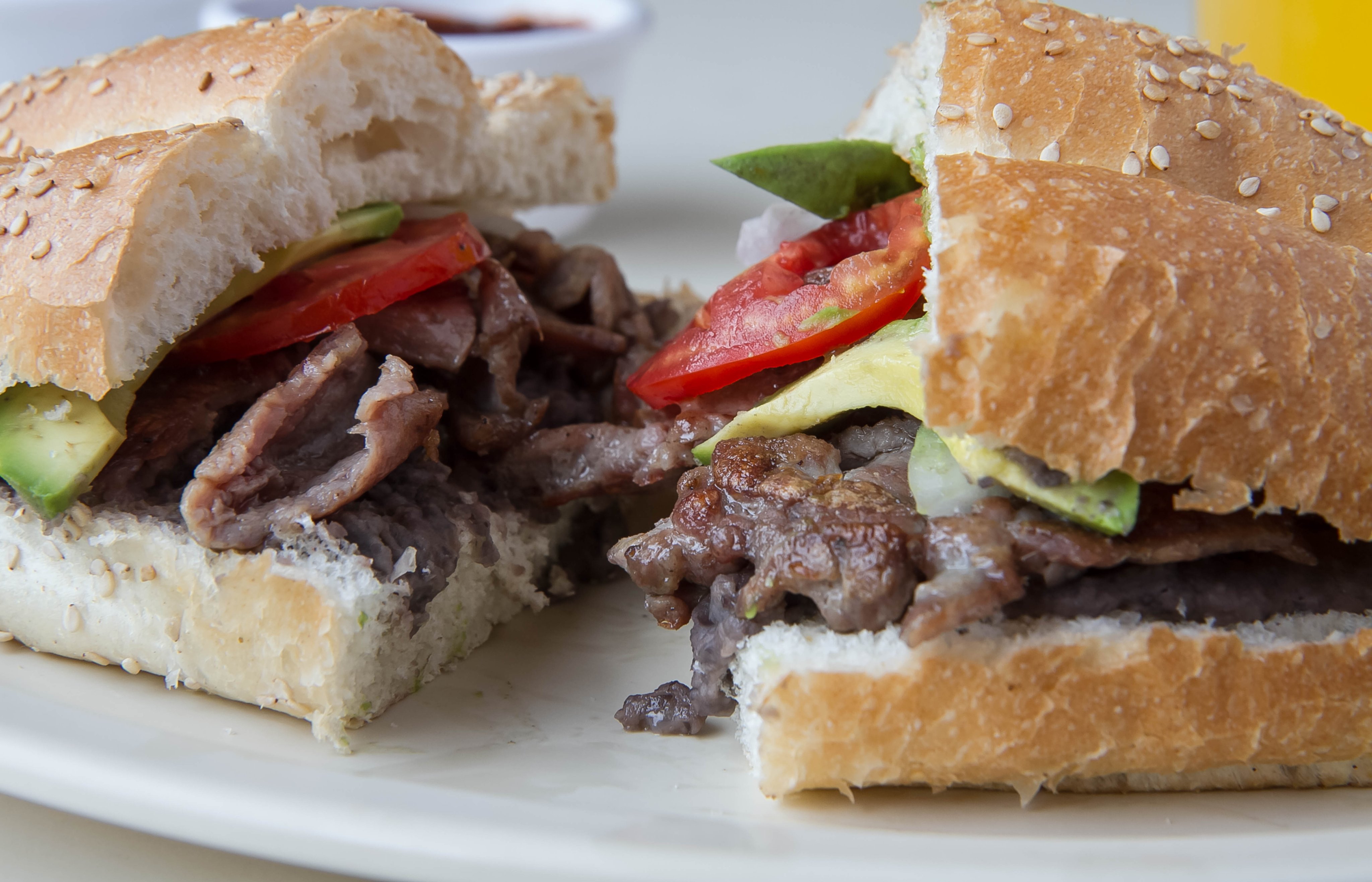 Deliciosa torta preparada con arrachera, queso mozzarella y papas doradas.