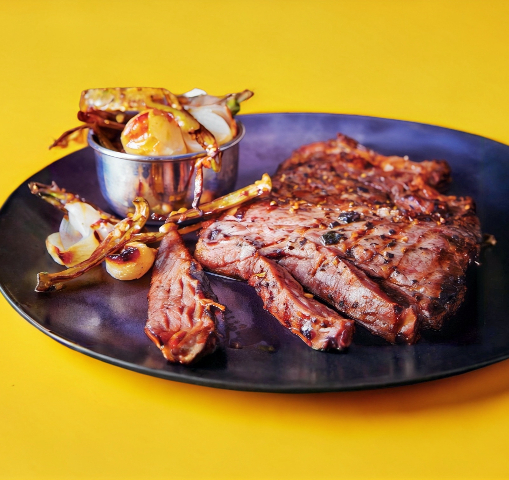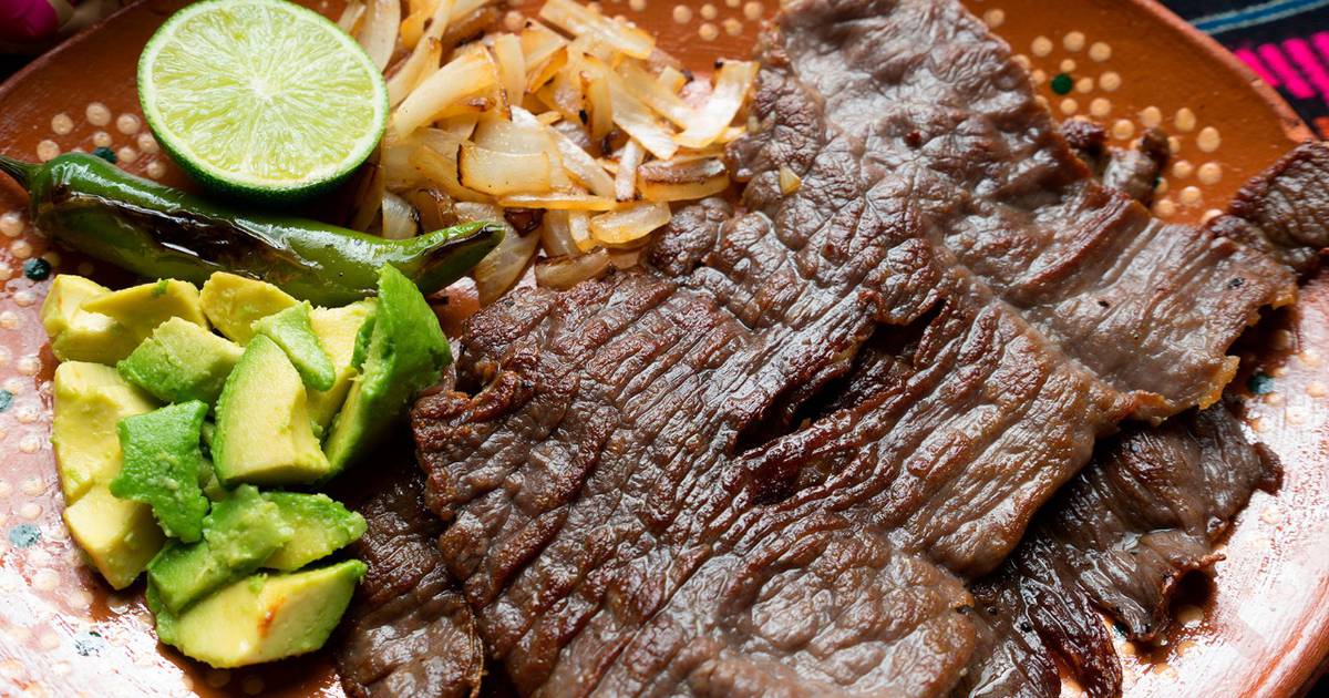 Arrachera marinada acompañada con guacamole, arroz y picaditas.