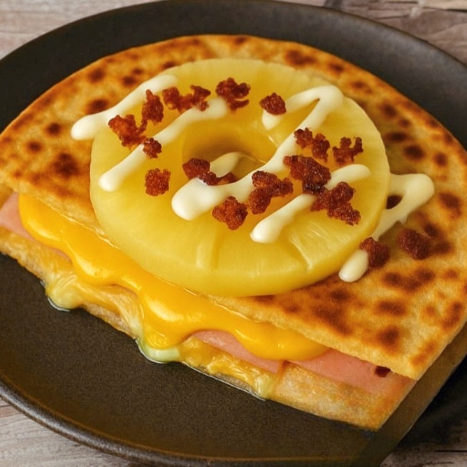 Una combinación dulce y salada que encanta: tortilla de harina con queso de hebra gratinado, queso amarillo americano, tocino crujiente, piña asada y un toque de mayonesa. Sabor tropical en cada bocado.