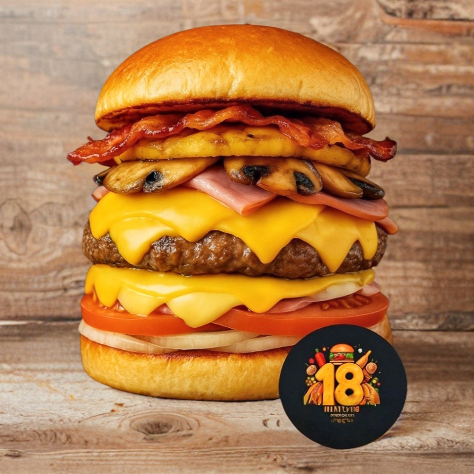 La reina de la casa: carne de res de 120 gramos con tocino crujiente, piña asada, jamón, champiñones salteados y una mezcla irresistible de quesos (manchego, de hebra y amarillo). Acompañada de lechuga y jitomate fresco en pan suave. Todo lo mejor en una sola hamburguesa.