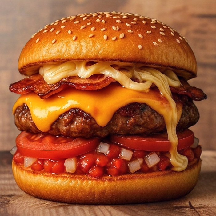 Una delicia para los amantes del queso: carne de res de 120 gramos con mezcla de queso manchego, queso de hebra y queso amarillo derretido, acompañada de tocino crujiente, lechuga, jitomate y pan suave. Cremosa, jugosa y poderosa.