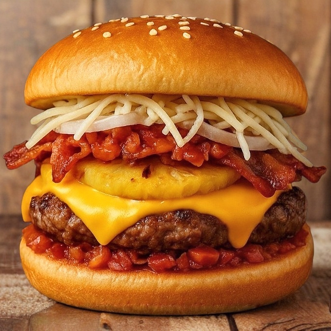xplosión de sabor tropical: carne de res jugosa 120 gramos, piña a la parrilla, jamón y queso de hebra gratinado, todo en un pan suave y dorado. Dulce, salada y totalmente irresistible.