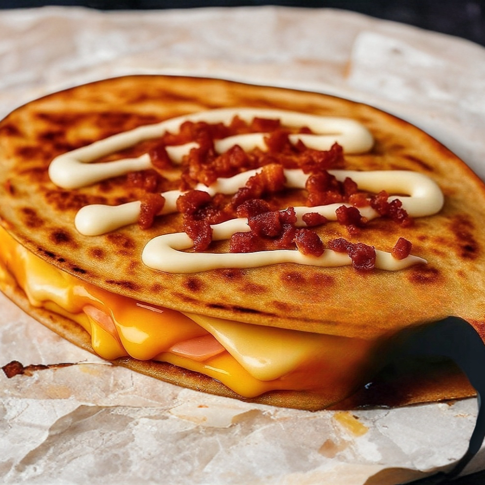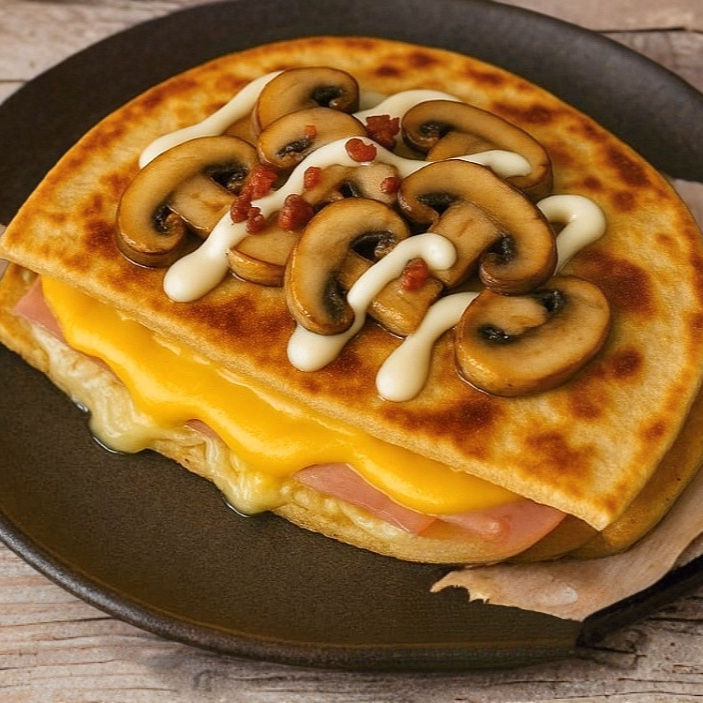 Deliciosa y reconfortante: tortilla de harina rellena con champiñones salteados, queso de hebra gratinado, queso amarillo americano, tocino crujiente y un toque de mayonesa. Una mezcla cremosa y llena de sabor.