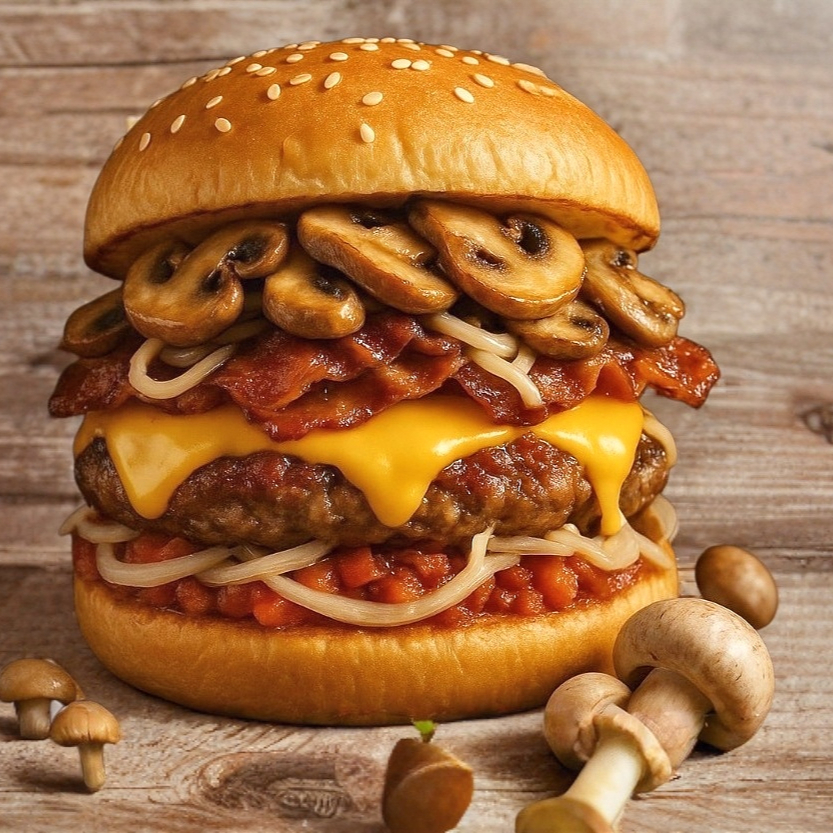 Sabor intenso y reconfortante: carne de res jugosa de 120 gramos con champiñones salteados, queso de hebra derretido, lechuga fresca y jitomate, todo en un pan suave. Una combinación cremosa y llena de sabor que conquista al primer bocado.