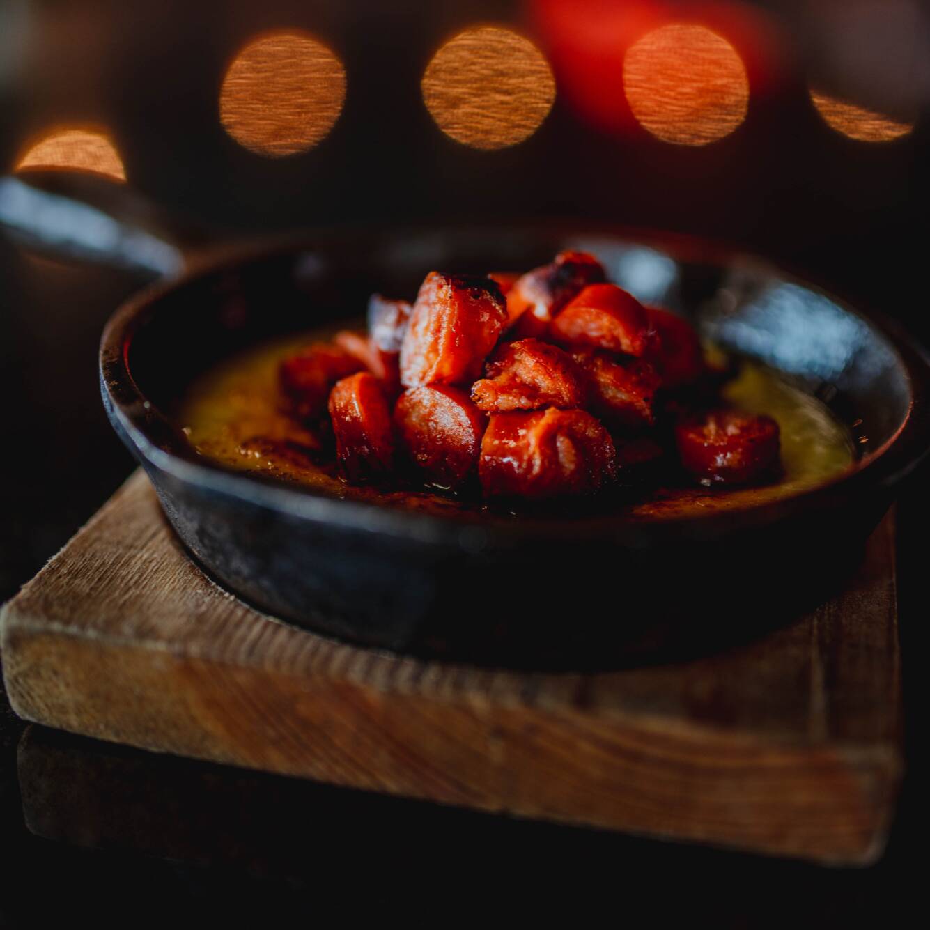 Papada de cerdo con salsa de chile chiltepín, cebolla y cilantro fresco. Acompañados de salsa chiltepín.